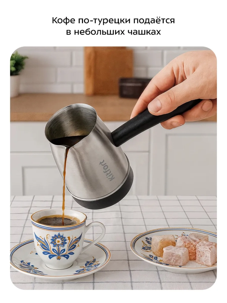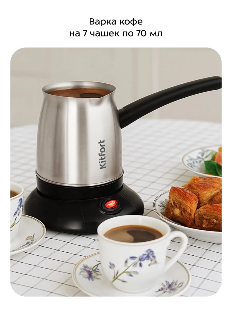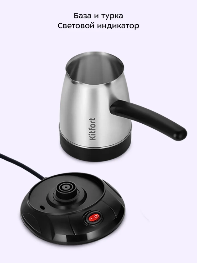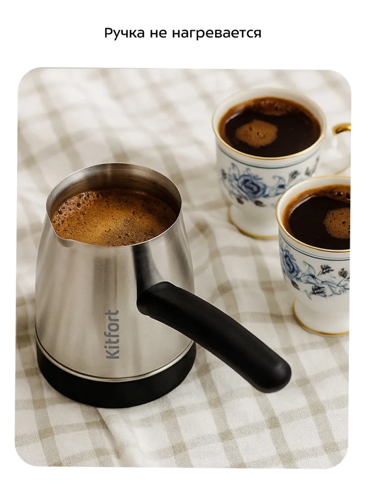 Электрическая турка Kitfort КТ-7490 варит кофе по-турецки. С ней вы сможете быстро и легко сварить натуральный кофе на 7 чашек по 70 мл. Устройство состоит из базы и турки.