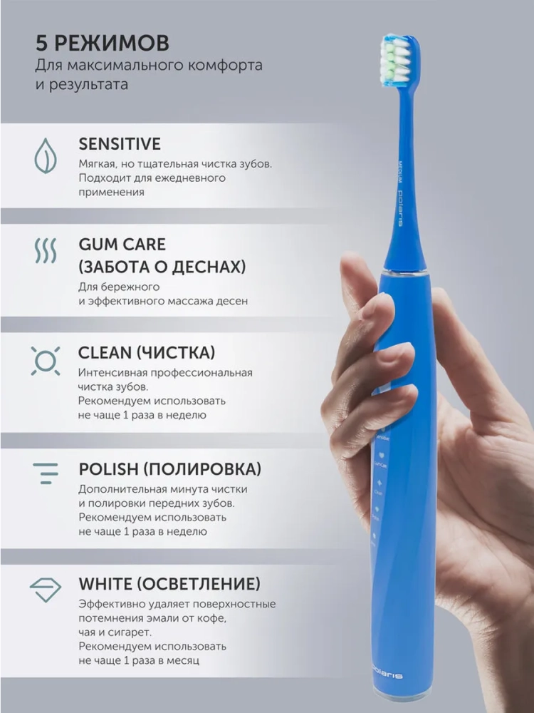 Электрическая зубная щетка Polaris PETB 0105 TC предназначена для комплексного ухода за полостью рта. Модель сочетает эффективную технику чистки с бережным воздействием на эмаль и десны. Подходит для ежедневного использования и специального ухода при чувствительных зубах, наличии коронок или брекетов.