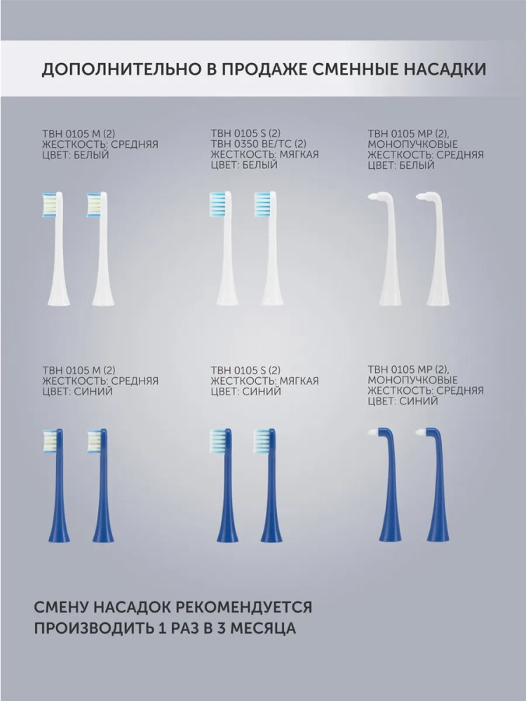 Электрощетка рекомендована для ухода за зубами с пломбами, коронками, имплантами, мостами, брекет-системами. Скорость движения насадок от 31000 до 48000 пульсаций в минуту гарантирует глубокое очищение. Щетинки Dupont из гипоаллергенного нейлона с закругленными концами не травмируют эмаль и десны. В комплекте 3 сменные насадки: мягкая для чувствительных десен, средней жесткости для ежедневного использования, монопучковая для профилактики кариеса и зубного камня.