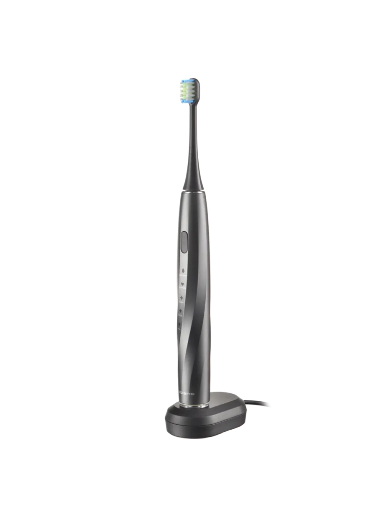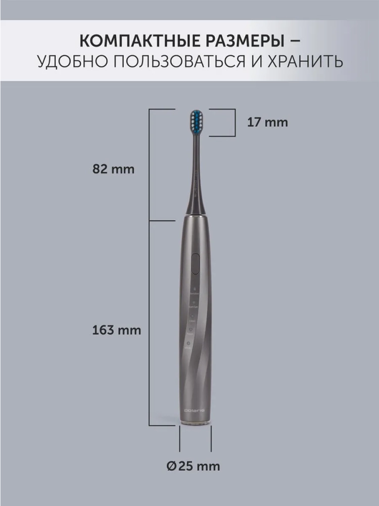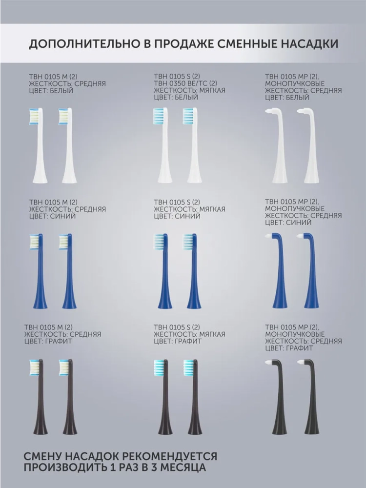 Электрощетка рекомендована для ухода за зубами с пломбами, коронками, имплантами, мостами, брекет-системами. Скорость движения насадок от 31000 до 48000 пульсаций в минуту гарантирует глубокое очищение. Щетинки Dupont из гипоаллергенного нейлона с закругленными концами не травмируют эмаль и десны. В комплекте 3 сменные насадки: мягкая для чувствительных десен, средней жесткости для ежедневного использования, монопучковая для профилактики кариеса и зубного камня.