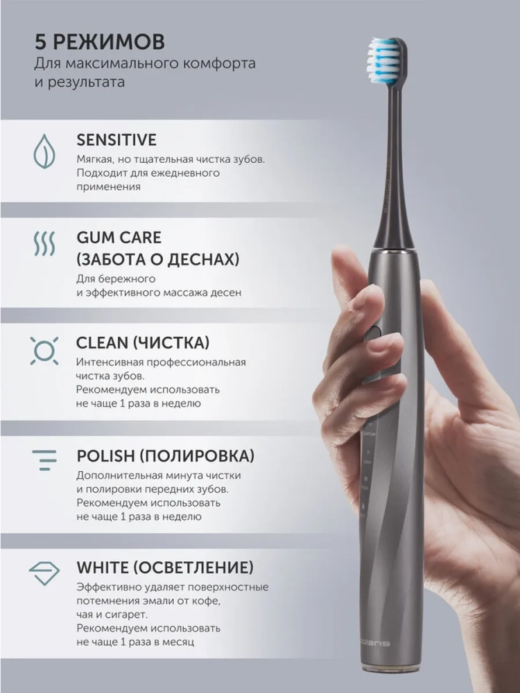 Электрическая зубная щетка Polaris PETB 0105 TC предназначена для комплексного ухода за полостью рта. Модель сочетает эффективную технику чистки с бережным воздействием на эмаль и десны. Подходит для ежедневного использования и специального ухода при чувствительных зубах, наличии коронок или брекетов.