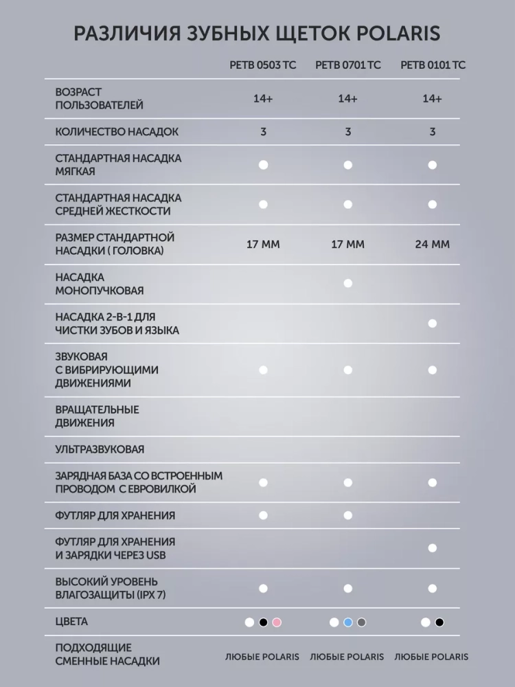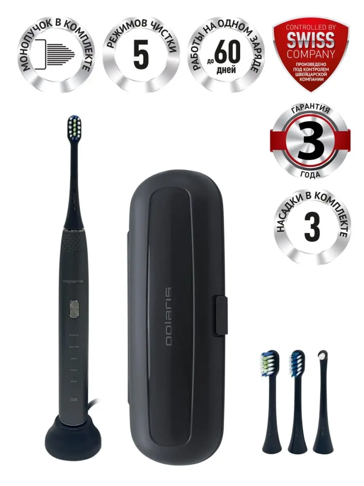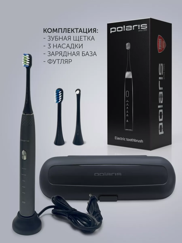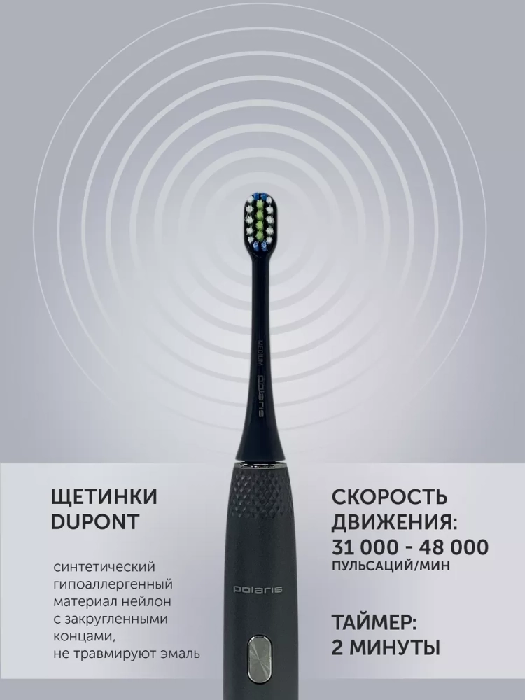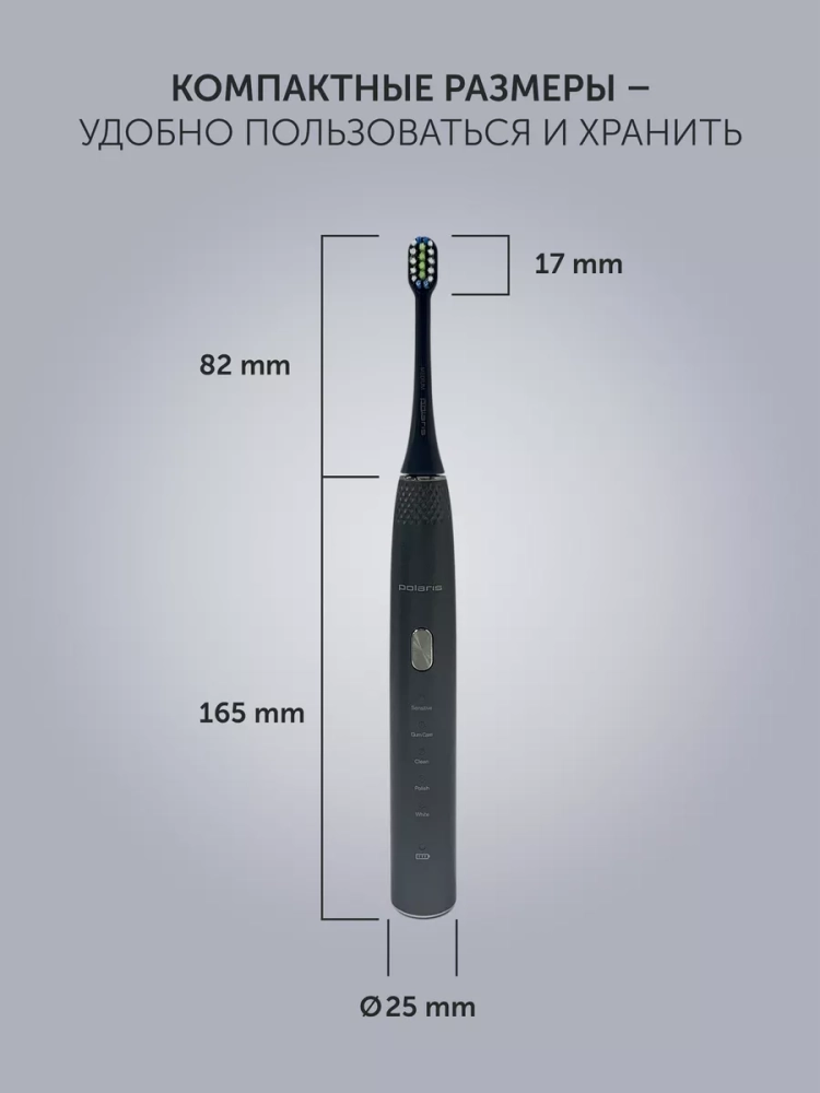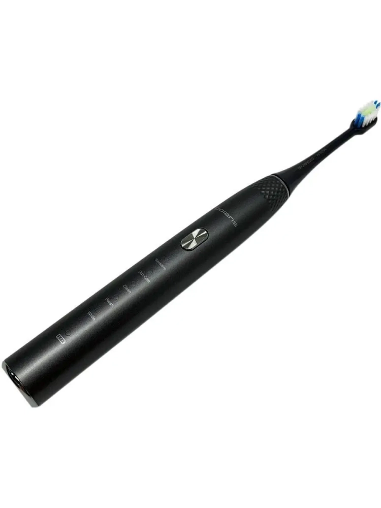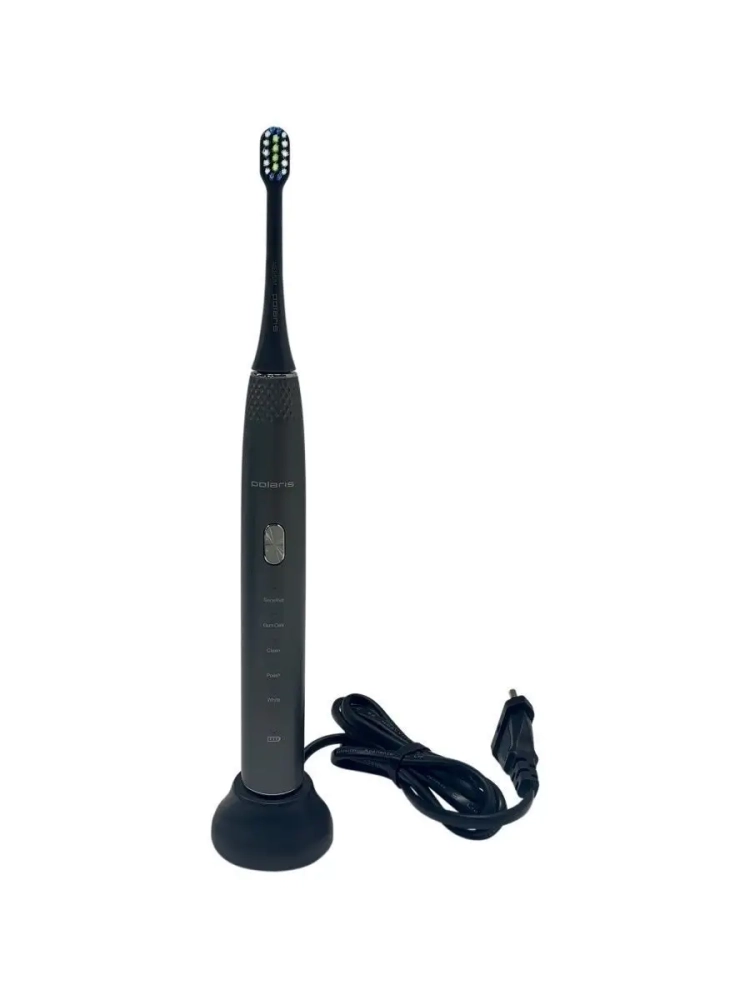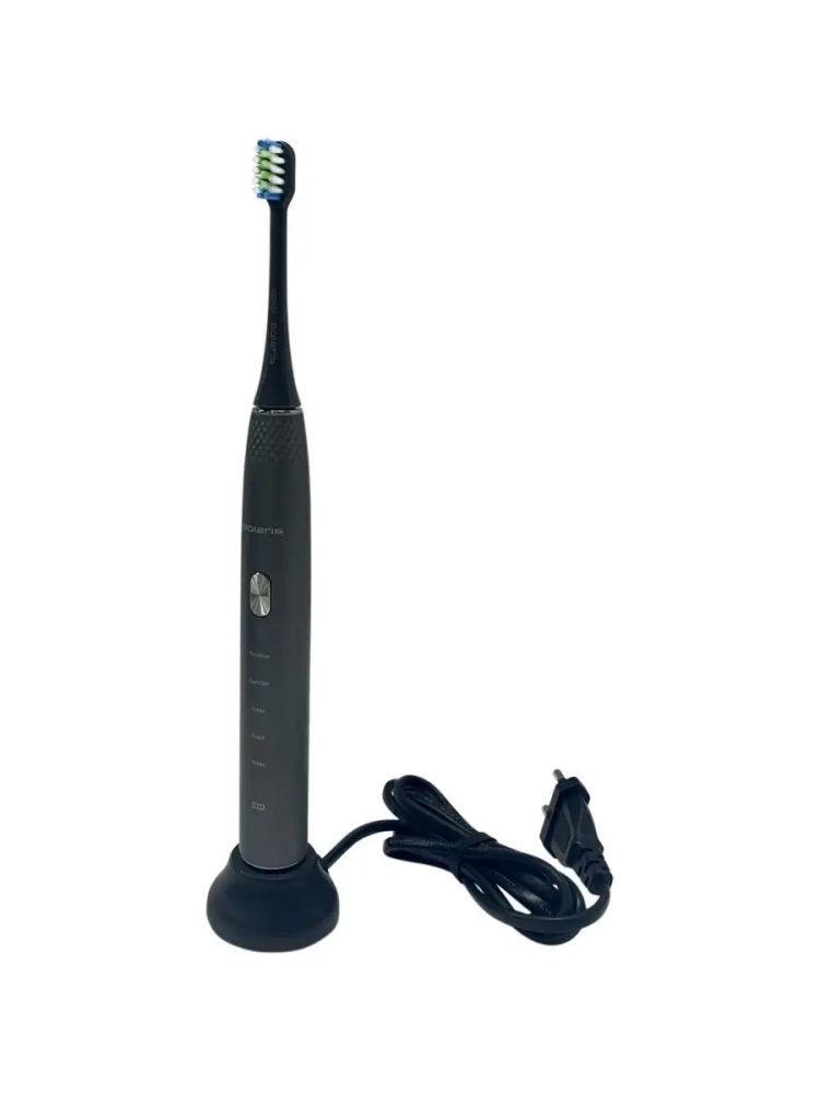 Зубная щетка PETB 0701 TC – это принципиально новый комплексный подход к чистке зубов. 5 режимов электрической звуковой зубной щетки Polaris – это как 5 стоматологических услуг. Они дают возможность получать необходимый профессиональный уход за зубами в домашних условиях на ежедневной основе, включая глубокую чистку на режиме и осветление эмали путем удаления поверхностного налета. В комплекте 3 насадки: насадка с мягкой щетиной, насадка средней жесткости, МОНОПУЧКОВАЯ насадка. Монопучковая насадка дает наилучший результат при чистке межзубных промежутков, десневого края, брекетов, мостов, имплантов. Режим Sensitive рекомендуется для ежедневного применения. На этом режиме литиевая аккумуляторная батарея держит заряд в течение 60 дней. В любом случае о необходимости подзарядить щетку напомнит индикатор заряда на рукоятке щетки.