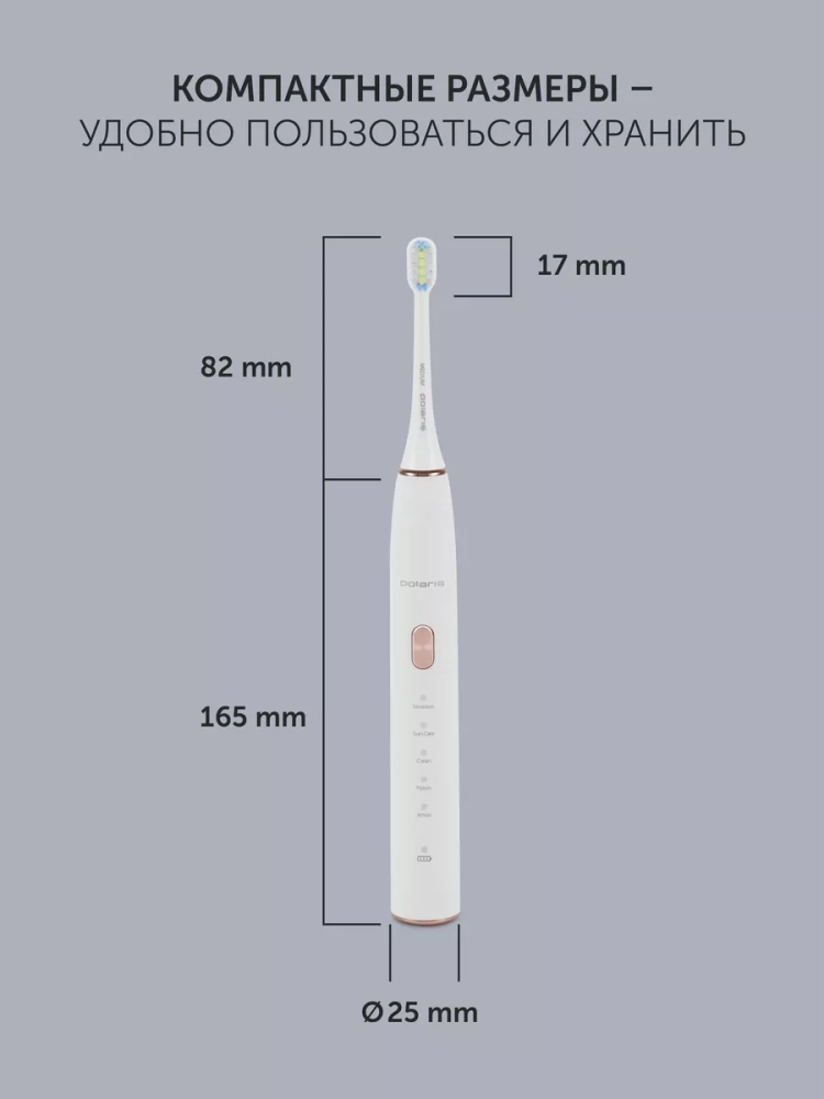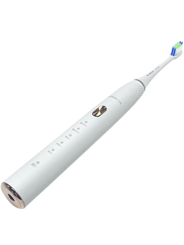 Зубная щетка PETB 0701 TC – это принципиально новый комплексный подход к чистке зубов. 5 режимов электрической звуковой зубной щетки Polaris – это как 5 стоматологических услуг. Они дают возможность получать необходимый профессиональный уход за зубами в домашних условиях на ежедневной основе, включая глубокую чистку на режиме и осветление эмали путем удаления поверхностного налета. В комплекте 3 насадки: насадка с мягкой щетиной, насадка средней жесткости, МОНОПУЧКОВАЯ насадка. Монопучковая насадка дает наилучший результат при чистке межзубных промежутков, десневого края, брекетов, мостов, имплантов. Режим Sensitive рекомендуется для ежедневного применения. На этом режиме литиевая аккумуляторная батарея держит заряд в течение 60 дней. В любом случае о необходимости подзарядить щетку напомнит индикатор заряда на рукоятке щетки.