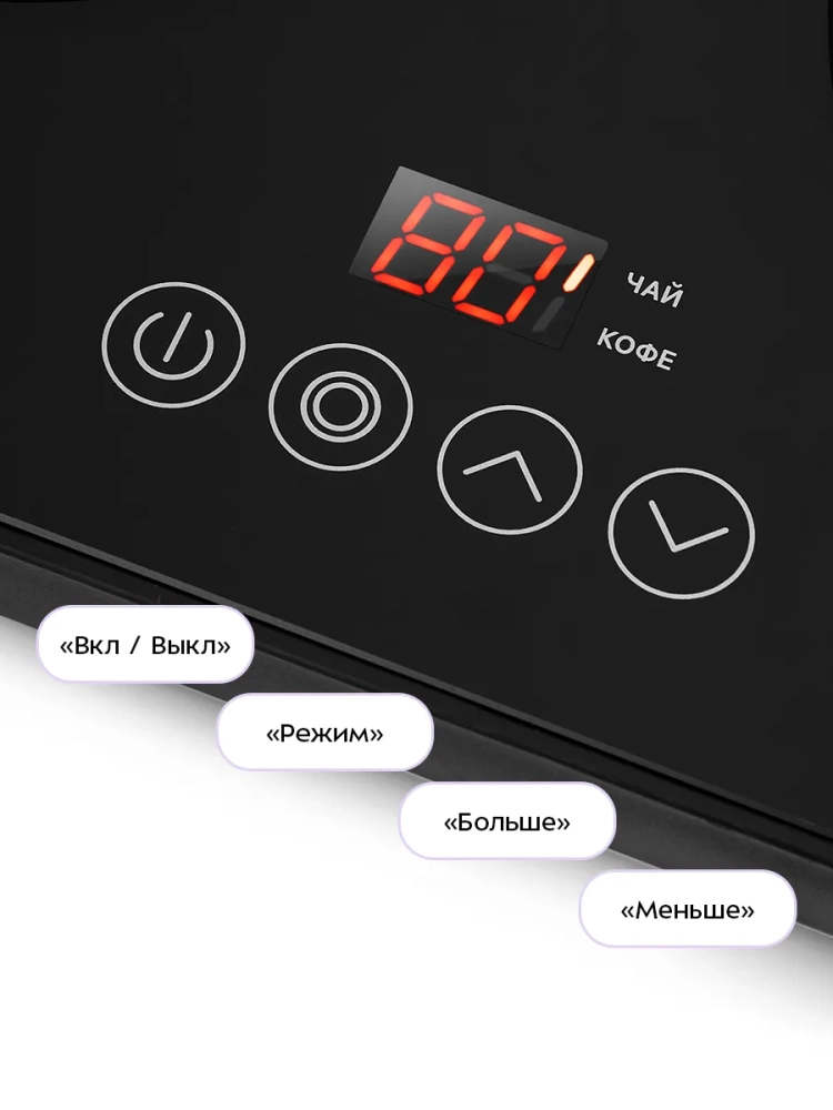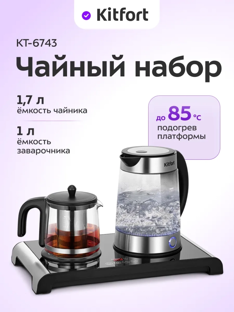 Электрический чайный набор KT-6743 от Kitfort — это превосходное решение для ценителей чая и кофе. В комплект входит электрический чайник объемом 1,7 литра и заварочный чайник на 1 литр с фильтром, а также база с подогревом. Этот стеклянный электрочайник не только вскипятит воду, но и позволит заварить любимый напиток, сохраняя его теплым до четырех часов благодаря встроенной платформе. Модель оснащена двумя режимами работы: "Чай" и "Кофе". На базе расположена панель управления с сенсорными кнопками для выбора режима и установки температурного режима платформы. В режиме "Чай" можно установить температуру от 60 до 80 °С (по умолчанию — 70 °С), а в режиме "Кофе" — от 75 до 85 °С (по умолчанию — 80 °С). Шаг изменения температуры составляет всего один градус Цельсия. База устройства изготовлена из прочной стеклокерамики, устойчивой к царапинам. Материалы корпуса включают стекло, пластик и нержавеющую сталь как у основного чайника, так и у заварочного элемента. Размеры устройства составляют компактные параметры: длина -435 мм; ширина -253 мм; высота -270 мм.