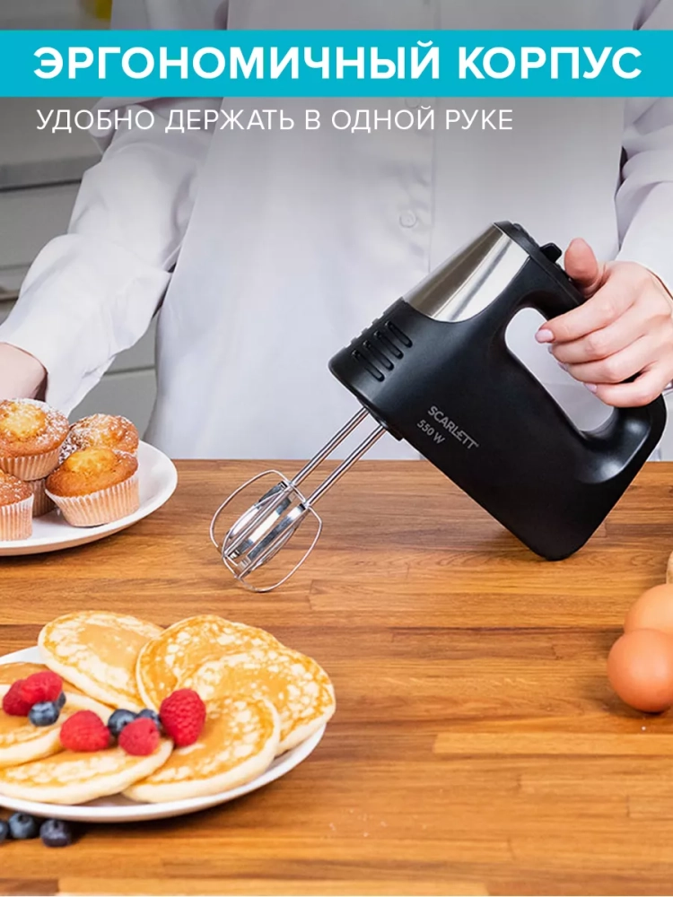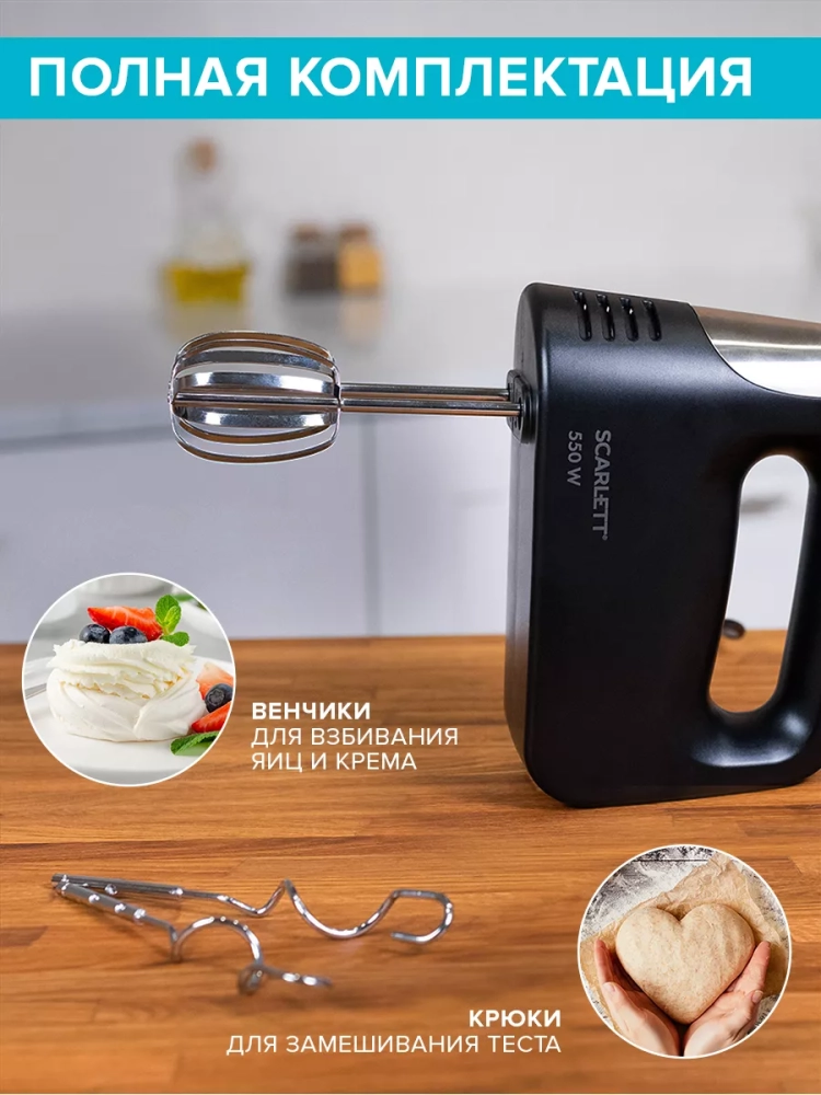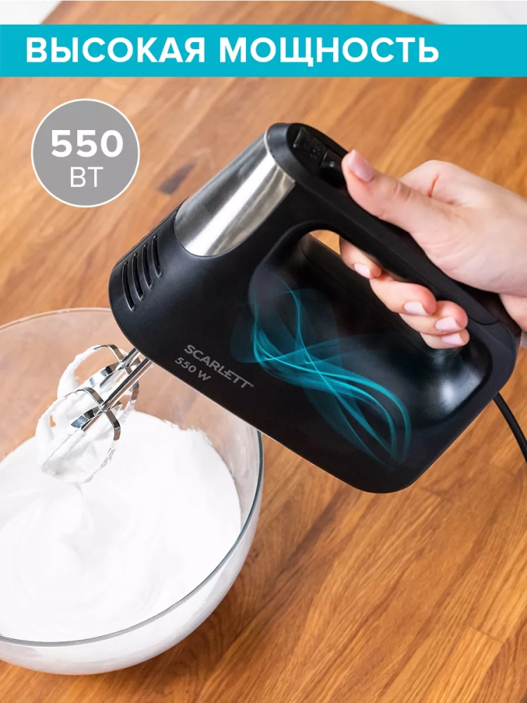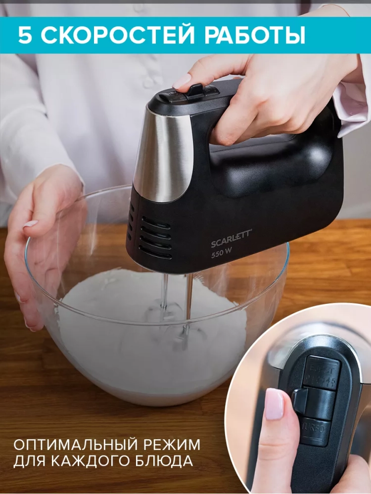 Ручной миксер Scarlett SC-HM40S23 эффективно справится с замешиванием теста или приготовлением крема для торта. Миксер укомплектован 2 венчиками для взбивания сливок и яиц и 2 насадками-крюками для замешивания теста, которые можно хранить непосредственно на приборе, обеспечивая компактное хранение. Корпус миксера выполнен из высококачественного пластика. Переключатель скоростей в диапазоне от 1 до 5 и кнопка отсоединения насадок удобно расположены на ручке прибора. Дополнительный режим Turbo поможет справиться с более сложными задачами.