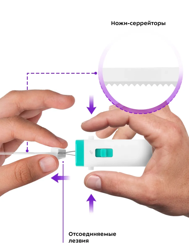 В корпус устройства вставляются два ножа-серрейтора, скрепленные между собой. Режущая кромка имеет зазубренную форму. При включении устройства скрепленные ножи начинают двигаться вперед-назад, обеспечивая пиление.
