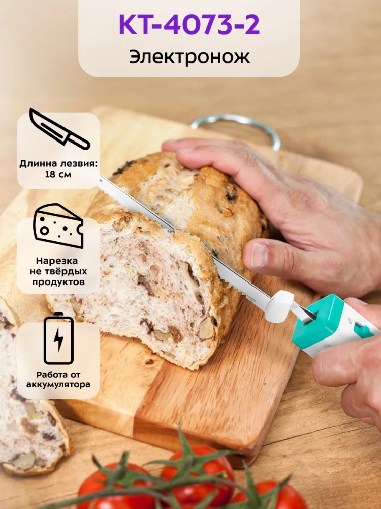 Беспроводной электронож Kitfort КТ-4073 — устройство, которое поможет вам быстро и легко нарезать продукты. Электронож используется для нарезки мягких и не очень твердых продуктов: хлеба и другой выпечки, колбас, сыров, огурцов, баклажанов и т. п. Данная модель не предназначена для разделывания костей, хрящей и других твердых продуктов.