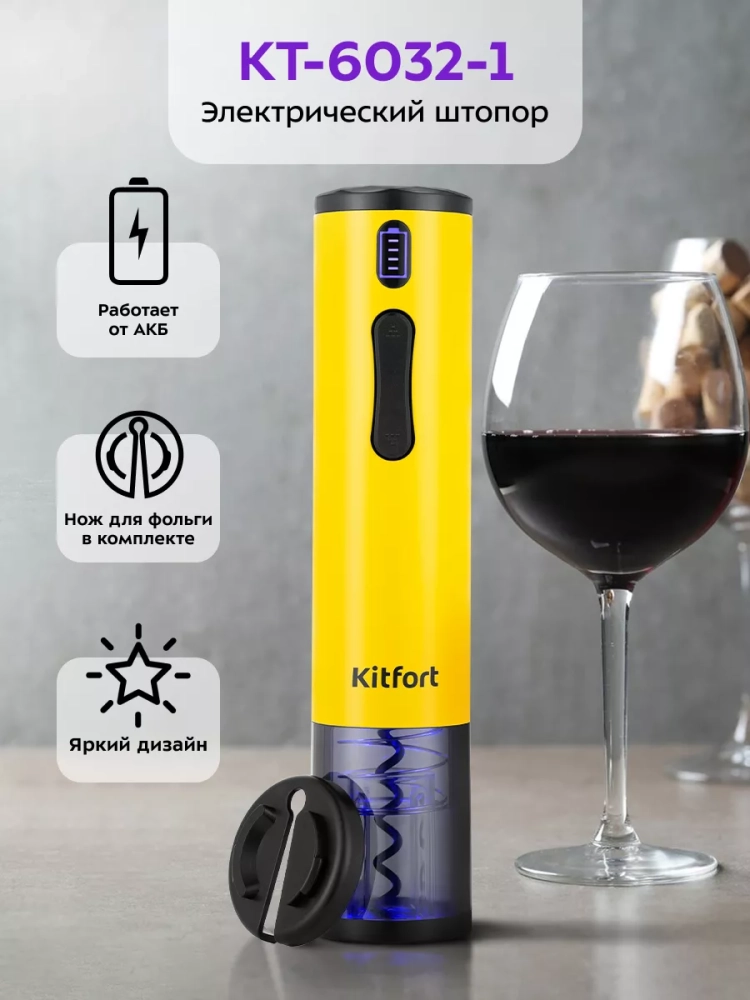 Электрический штопор Kitfort KT-6032 поможет легко, быстро и безопасно открыть бутылку вина. Процесс открывания бутылки станет простым и займет всего несколько секунд. Также вам больше не придется прикладывать дополнительные усилия, как это часто бывает при использовании обычного штопора. Электрический штопор предотвращает риск пролить вино или пораниться. С электрическим штопором вы можете эффектно открыть вино для подачи к столу и удивить гостей.