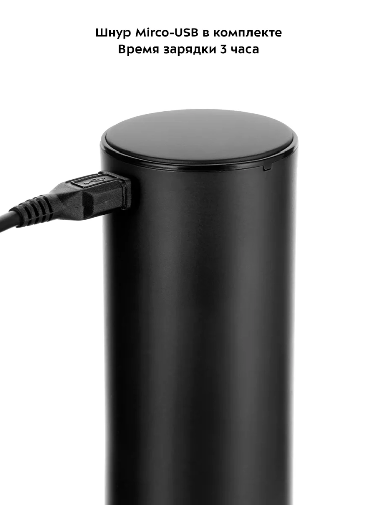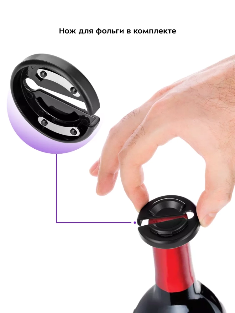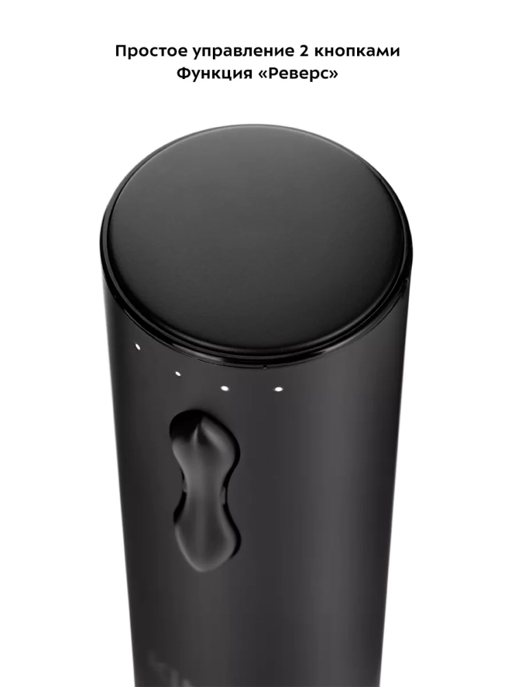Устройство питается от встроенного аккумулятора. На верхней части корпуса есть индикатор заряда. Если вам необходимо открыть бутылку вина, а аккумулятор штопора разряжен, вы можете поставить штопор на зарядку всего на 1,5 минуты — этого хватит, чтобы открыть 2 бутылки вина.