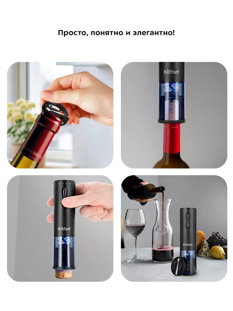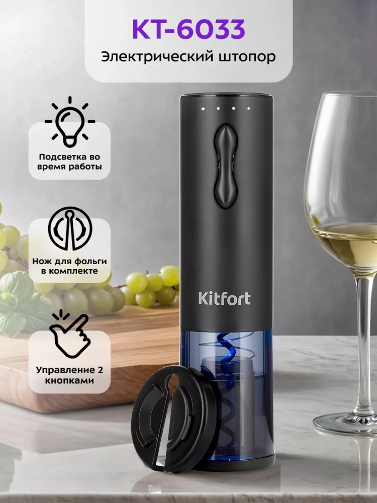Электрический штопор Kitfort KT-6033 поможет легко, быстро и безопасно открыть бутылку вина. Процесс открывания бутылки станет простым и займет всего несколько секунд. Также вам больше не придется прикладывать дополнительные усилия, как это часто бывает при использовании обычного штопора. Электрический штопор предотвращает риск пролить вино или пораниться. С электрическим штопором вы можете эффектно открыть вино для подачи к столу и удивить гостей.