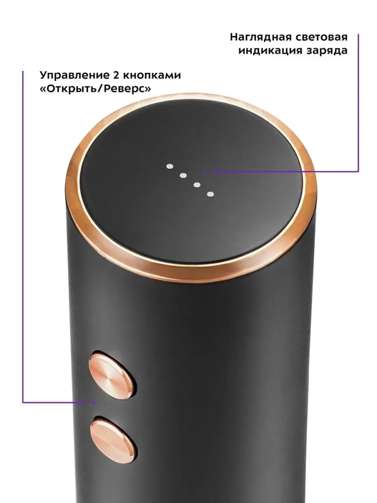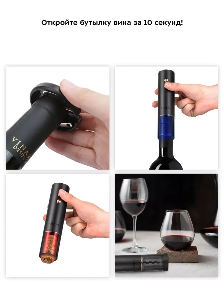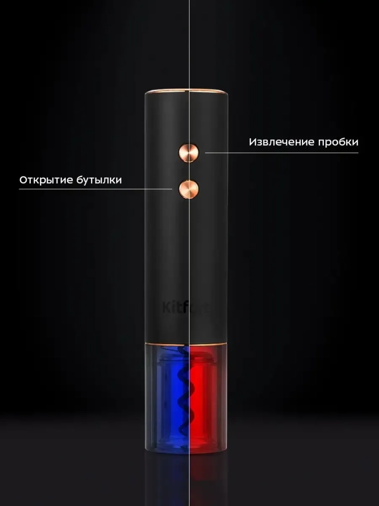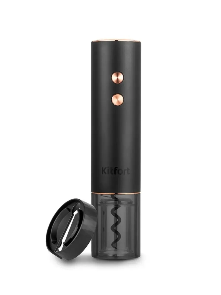 Электрический штопор Kitfort KT-4039 поможет легко, быстро и безопасно открыть бутылку вина. Процесс открывания бутылки станет простым и займет всего несколько секунд. Также вам больше не придется прикладывать дополнительные усилия, как это часто бывает при использовании обычного штопора. Электрический штопор предотвращает риск пролить вино или пораниться. С электрическим штопором вы можете эффектно открыть вино для подачи к столу и удивить гостей. Корпус устройства выполнен из металла и пластика, а спираль полностью скрыта корпусом. Чтобы наблюдать за процессом, нижняя часть корпуса прозрачная. В комплекте есть специальный нож для фольги, который крепится к нижней части штопора для хранения. Пользоваться электрическим штопором очень просто, так как у него всего две кнопки: при нажатии на нижнюю кнопку штопор открывает пробку, а при нажатии на верхнюю кнопку включается движение в обратном направлении, чтобы удалить пробку из штопора. Во время работы штопора включается подсветка. Устройство питается от встроенного аккумулятора. На верхней части корпуса есть индикатор заряда. У штопора KT-4039 есть функция быстрой зарядки: если аккумулятор сел, а вам необходимо открыть пару бутылок вина, вы можете подзарядить штопор в течение 90 секунд. Этого хватит, чтобы открыть до 4 бутылок вина. Благодаря строгому, минималистичному дизайну и небольшим размерам электрический штопор легко впишется в ваш интерьер.