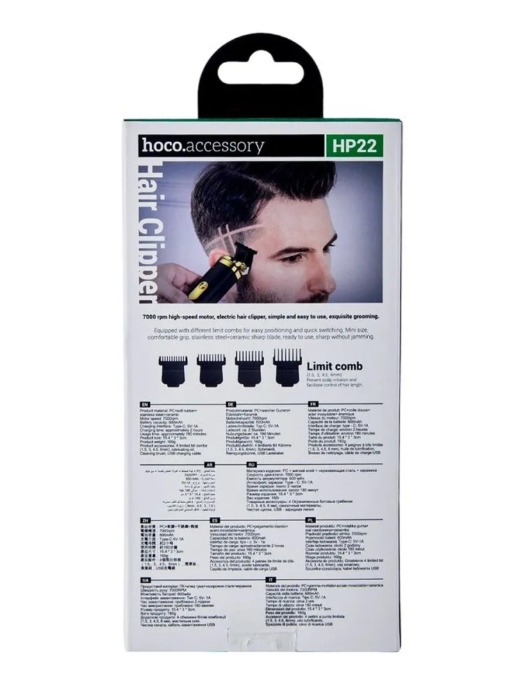 Электрическая машинка для стрижки от Hoco – это идеальный выбор для профессионального использования или для домашнего ухода за волосами. Она выполнена из нержавеющей стали, керамики и поликарбоната, что делает её прочной и долговечной.Компактные размеры (15,4 * 3 * 3 см) и лёгкий вес (160 г) позволяют использовать машинку с комфортом. Аккумулятор ёмкостью 600 мАч обеспечивает до 3 часов непрерывной работы, а время зарядки составляет всего 2 часа.Машинка оснащена двигателем с частотой вращения 7000 об/мин. Ручка имеет возможность регулировки угла наклона до 45°. В комплекте идут 4 насадки разной длины (1,5/3/4,5/6 мм), смазочное масло, щётка и кабельное зарядное устройство.Уникальный дизайн, гладкая поверхность и улучшенная эргономика делают использование этой машинки максимально удобным и эффективным. Она подходит для стрижки волос, ухода за бородой и усами, а также для детских стрижек.Бесшумный электронный аппарат с регулировкой длины лезвий и возможностью подключения к сети делает эту машинку универсальным инструментом для различных видов стрижек. Насыщенный набор аксессуаров делает её отличным подарком для мужчины, заботящегося о своём внешнем виде.