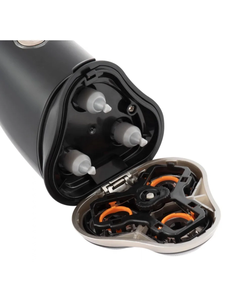 Есть три скользящие головки, которые цепляют даже самые маленькие волоски, а также повторяют контуры лица, проникая в труднодоступные места. Лезвия можно промывать под водой за счёт водонепроницаемого корпуса. Подровнять бороду и усы можно при помощи откидного триммера.