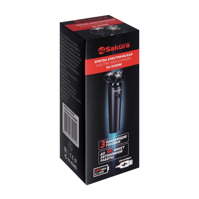 Электробритва Sakura SA-5430BK, 5 Вт, роторная, 3 головки, сухое бритьё, АКБ, чёрная