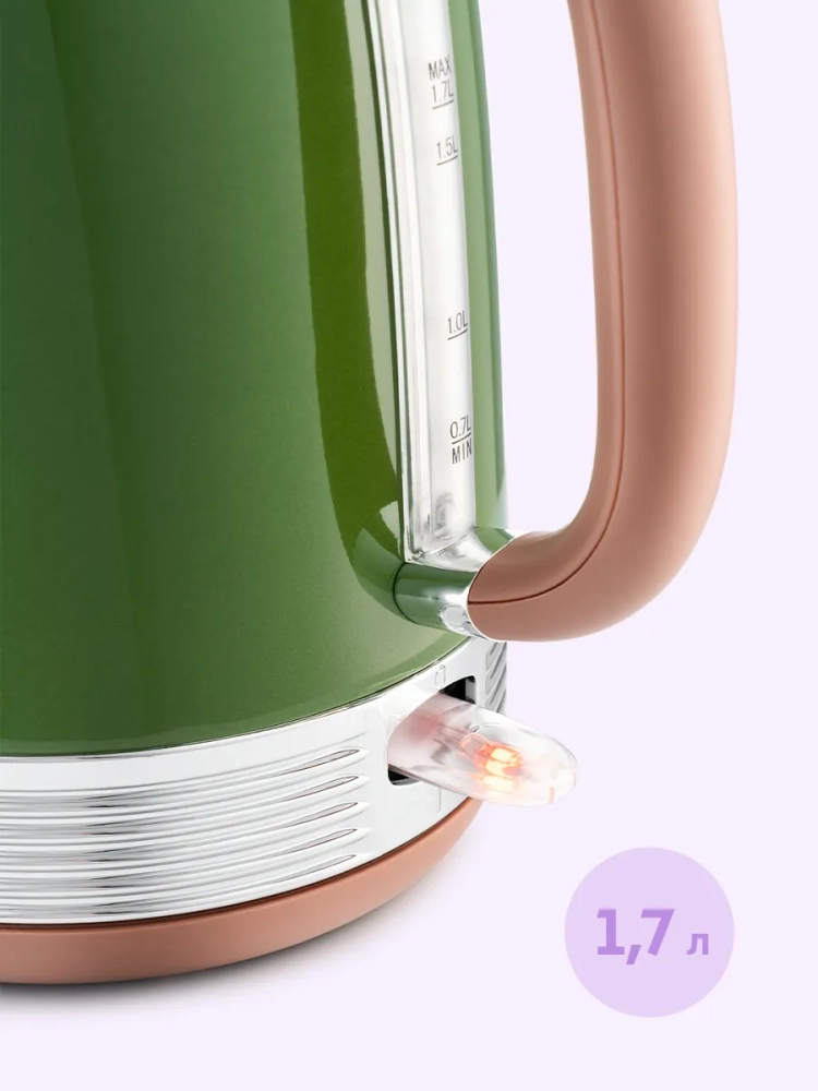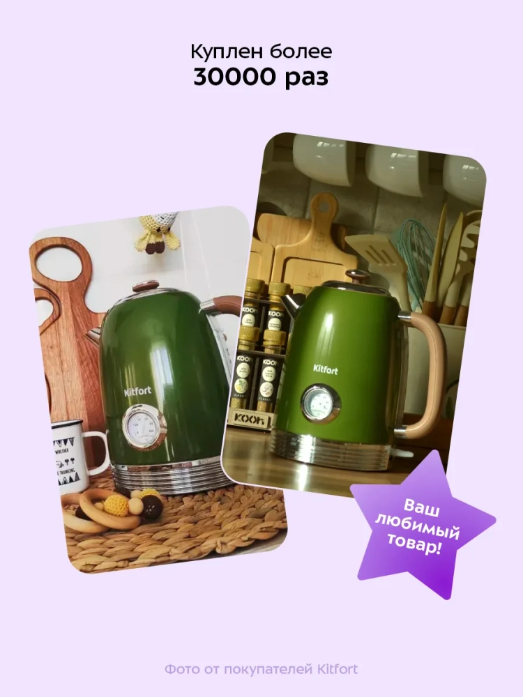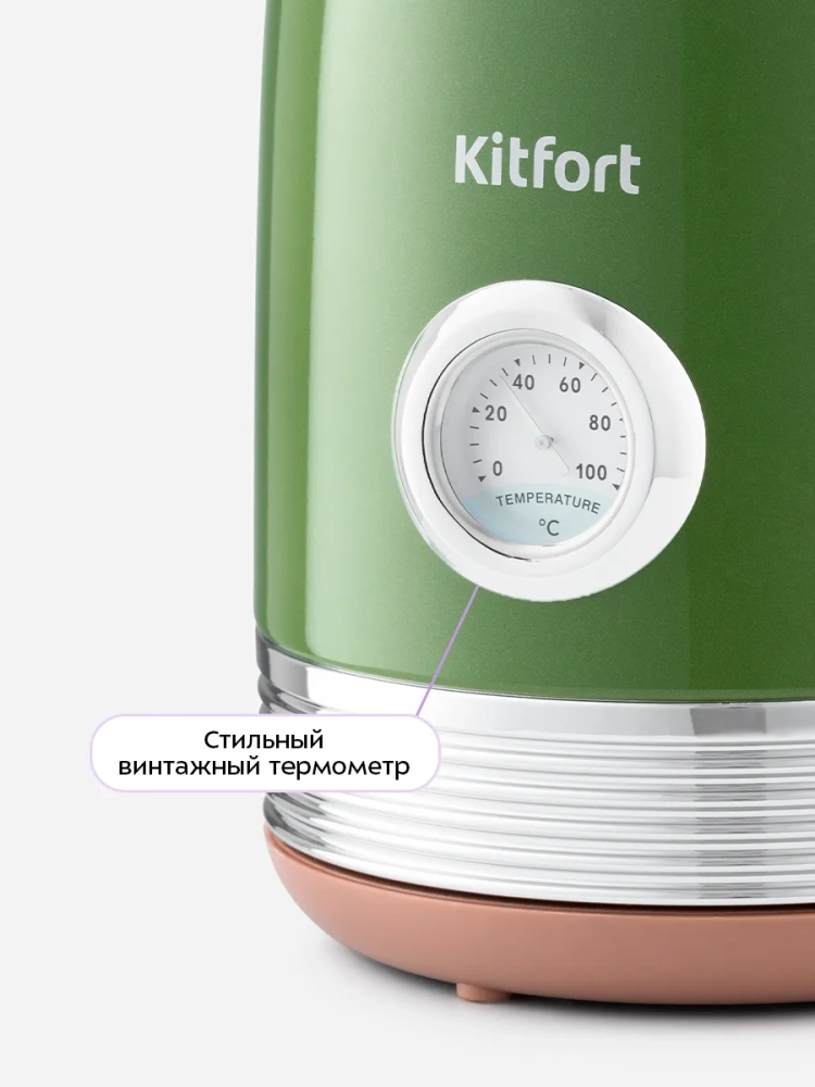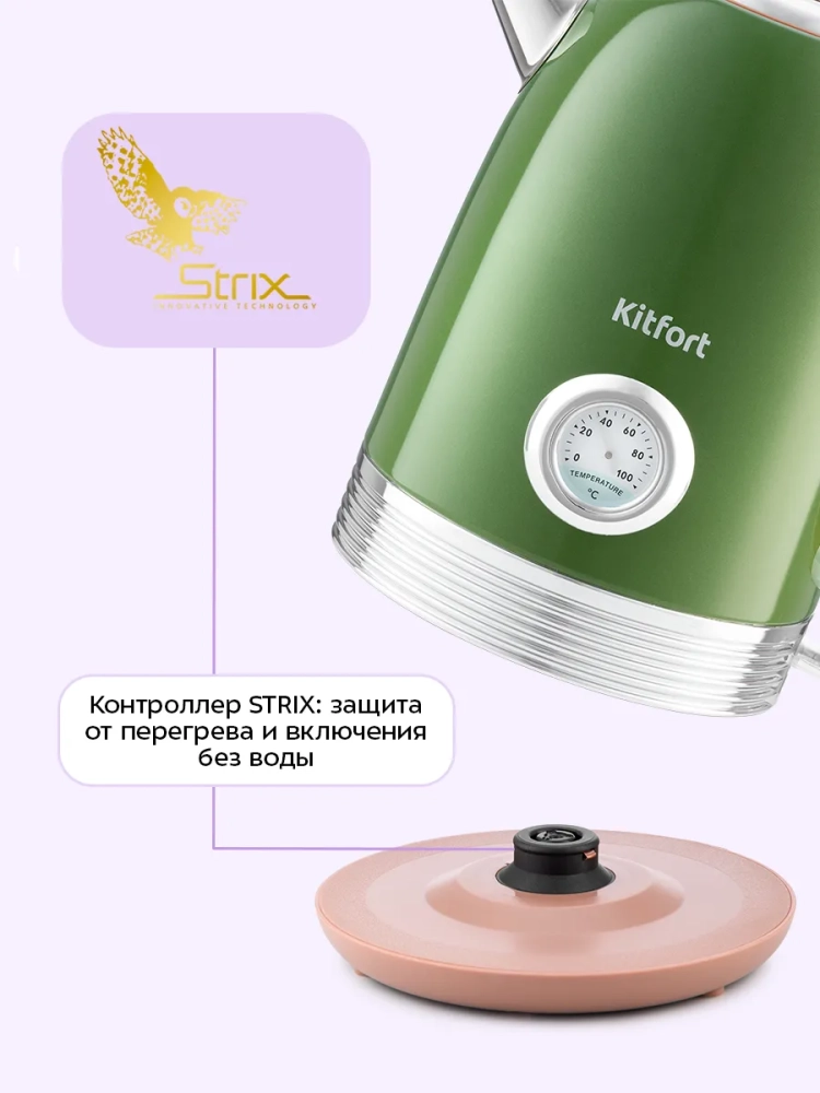 Электрический чайник Kitfort КТ-6110 — это надежная бытовая техника для кухни, которая идеально подходит для кипячения воды дома, в офисах и на дачах. Этот электрочайник ёмкостью 1,7 литров обладает мощностью, позволяющей использовать его даже в домах со слабой проводкой. Корпус и крышка выполнены из нержавеющей стали, что придает ему прочность и долговечность. Подставка изготовлена из пластика с центральным контактом, обеспечивающим вращение на 360°, что позволяет удобно располагать чайник в любом положении. Чайник оснащен мерной шкалой на задней стороне корпуса и удобной пластиковой ручкой, которая не нагревается во время работы. Кнопка включения расположена снизу корпуса напротив носика; при активации загорается индикатор работы. Встроенный термометр биметаллического типа показывает температуру воды внутри чайника — это особенно полезно для приготовления напитков с определенной температурой воды: зеленого чая или кофе. Нагревательный элемент (ТЭН) скрыт под металлической пластиной из нержавеющей стали в донной части прибора. Такая конструкция предотвращает образование накипи и снижает шум при нагревании воды. Съемный фильтр от накипи из нейлона расположен в носике чайника; он задерживает частички накипи, предотвращая их попадание в чашку. Полный электрочайник объемом 1,7 литра закипит всего за 7 минут благодаря своей высокой мощности и автоматически отключится после этого процесса для безопасности использования. Чайник также имеет защиту от перегрева: если он включается без воды или перегревается, то автоматически отключается.