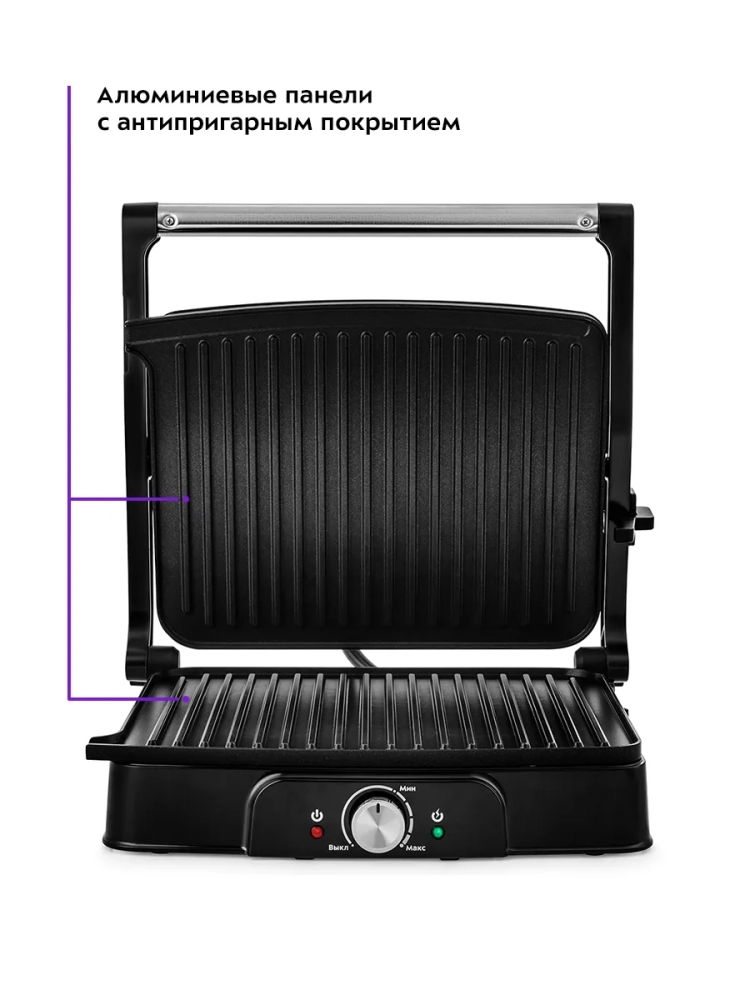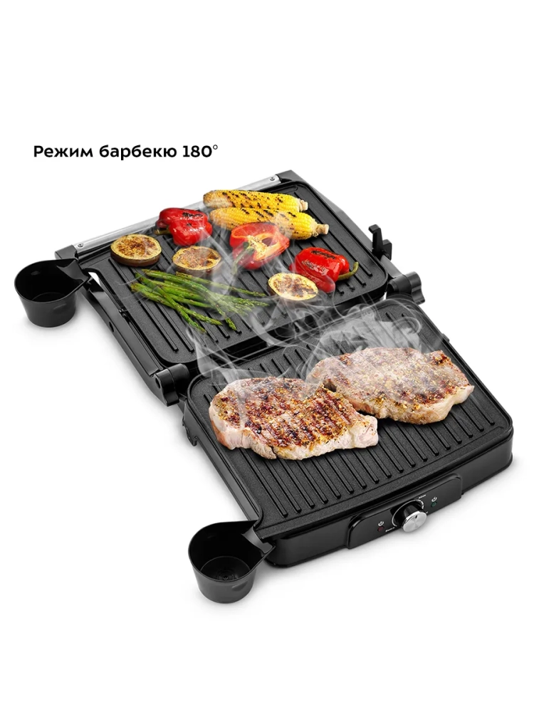Электрогриль Kitfort КТ-1655 — это идеальное многофункциональное решение для любителей вкусной и быстрой еды. Этот электрический гриль предназначен для приготовления разнообразных блюд, таких как мясо, рыба, овощи, сосиски и бутерброды, panini. Благодаря высокой температуре и ребристой поверхности панели продукты приобретают аппетитный полосатый рисунок. Электрогриль оснащен тремя режимами работы: двусторонним, односторонним и с приоткрытой крышкой. В двустороннем режиме продукты готовятся между двумя нагреваемыми панелями одновременно с обеих сторон. Односторонний режим позволяет использовать кухонный гриль как большую жаровню благодаря откидыванию крышки на 180°, что дает возможность выкладывать продукты сразу на две панели. Антипригарное покрытие алюминиевых панелей обеспечивает легкость в уходе за устройством после использования. Электрогриль оборудован термостатом для поддержания постоянной температуры панелей и индикаторами включения устройства в сеть и нагрева панелей. Специальные бороздки на нижней и верхней панелях собирают жир, соки и лишний маринад во время приготовления пищи. Этот бытовой электрический прибор идеально подходит для домашнего использования или барбекю на открытом воздухе благодаря своей универсальности и простоте эксплуатации. Готовьте любимые блюда быстро с помощью электрического гриля Kitfort! Панель управления интуитивно понятна даже новичкам в кулинарии.