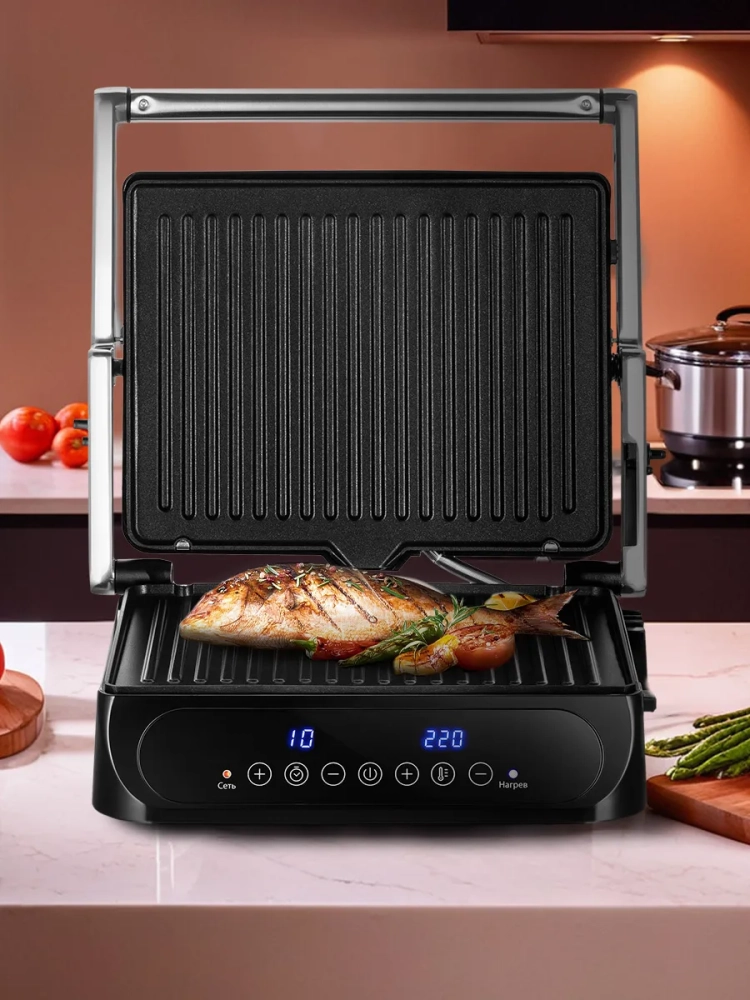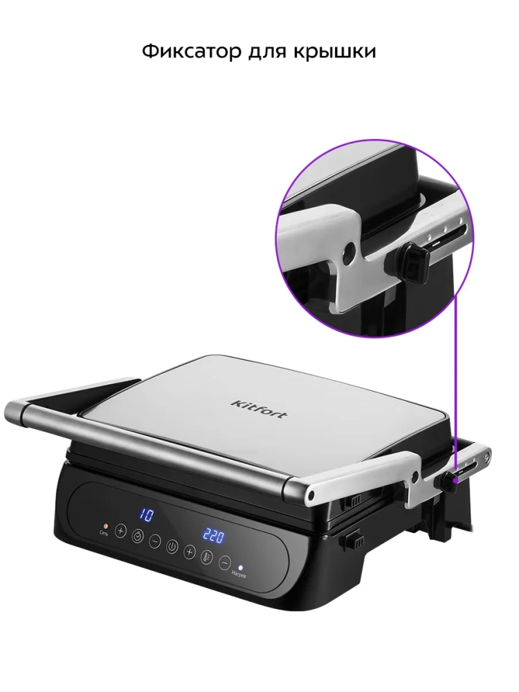 Электрогриль КТ-3697 позволяет регулировать время и температуру приготовления. Гриль оснащен дисплеем, а также термостатом для поддержания температуры панелей.
