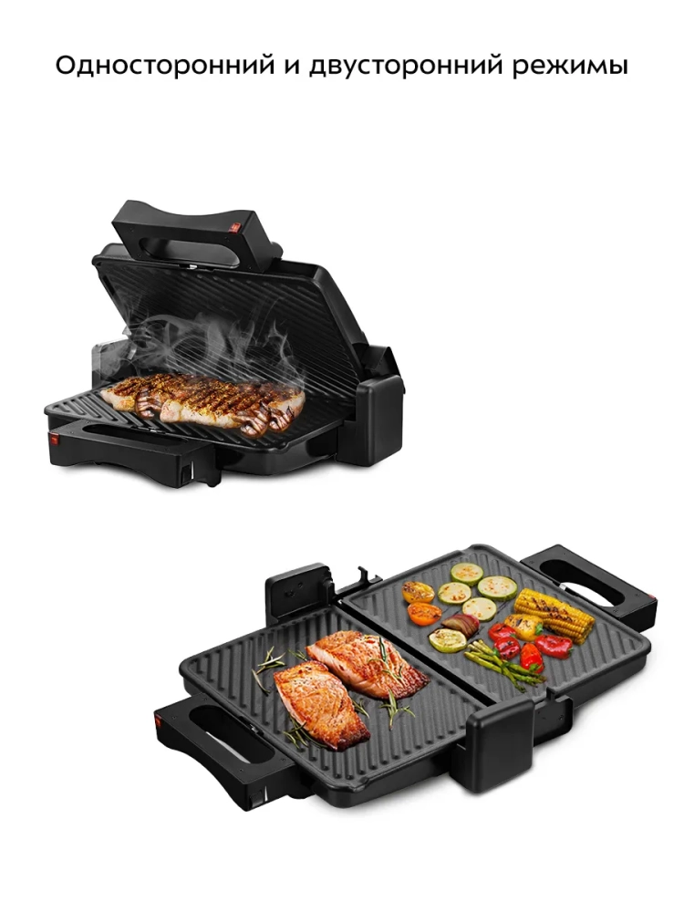Конструкция электрогриля позволяет готовить в двух режимах: двустороннем и одностороннем. В двустороннем режиме электрогриль закрывается крышкой, так что продукты находятся между двух нагреваемых панелей и готовятся с двух сторон сразу. Такой способ позволяет сократить время готовки, а также не требует переворачивания продуктов во время приготовления. В одностороннем режиме крышка гриля откидывается на 180°, благодаря чему гриль превращается в большую жаровню, а продукты можно выложить сразу на две панели.