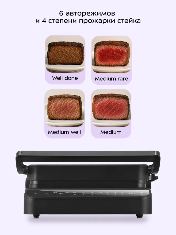 Также у гриля предусмотрено 6 автоматических режимов и 4 степени прожарки стейка с предустановленными настройками температуры и времени.