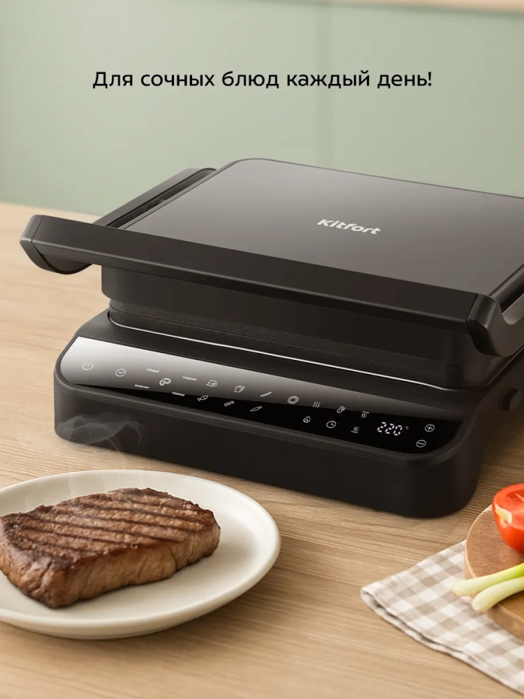 Электрогриль Kitfort КТ-4662 предназначен для приготовления мяса, рыбы, овощей, сосисок, бутербродов, панини, сэндвичей, гренок, тостов и многих других блюд. Высокая температура способствует быстрому приготовлению продуктов, а ребристая поверхность панелей — появлению на них характерного «полосатого» рисунка.