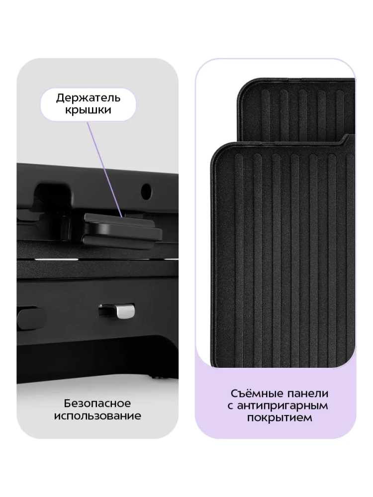 Панели гриля съемные и изготовлены из алюминия. На них нанесено антипригарное покрытие. Это позволяет использовать минимум масла в процессе готовки. Такое покрытие и возможность снять панели облегчают процесс чистки панелей.