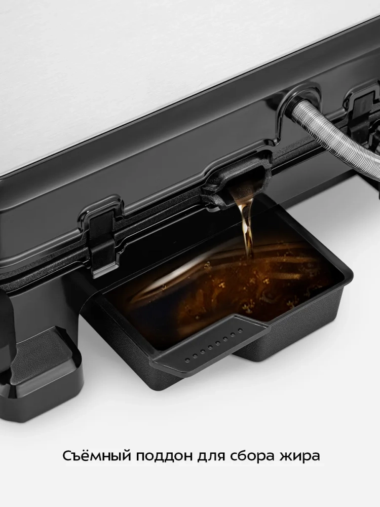 Данная модель оснащена поддоном для слива жира и сока, которые выделяются в процессе приготовления продуктов, а также имеет выдвигающуюся ножку для лучшего стекания сока и жира в поддон.
