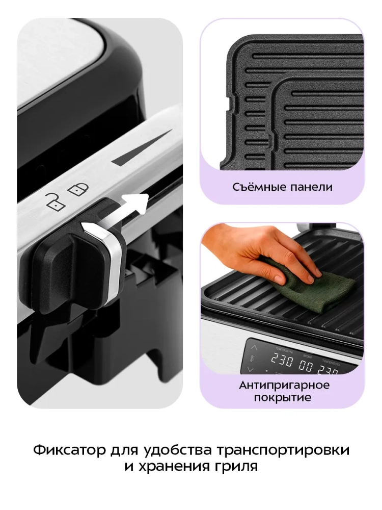 На панели нанесено антипригарное покрытие, что позволяет готовить с минимальным количеством масла. Такое покрытие также облегчает процесс чистки панелей. Панели у прибора съемные.