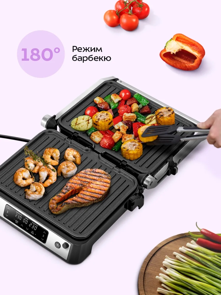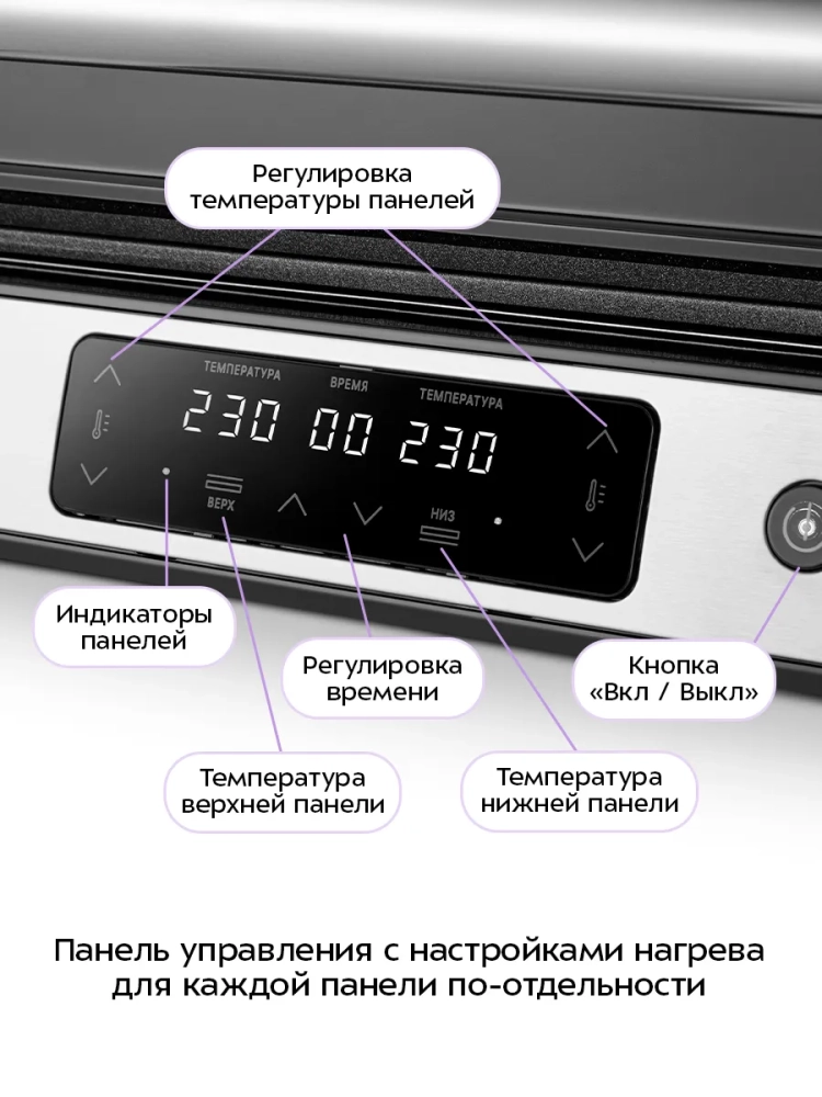 Прибор оснащен сенсорной панелью управления, с помощью которой вы сможете установить желаемую температуру приготовления и время таймера.
