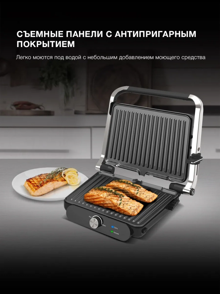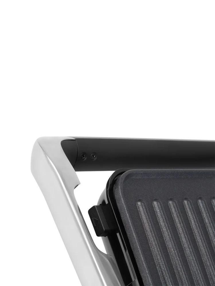 Модель оснащена съемными панелями, которые легко промываются под водой. Плавная механическая регулировка температуры позволяет точно настраивать нагрев под тип продукта — от бутербродов до стейков. Световая индикация подсказывает, когда гриль включён и когда достигнута нужная температура. Устройство открывается на 180 градусов, поэтому его можно использовать как полноценную жарочную поверхность для барбекю.
