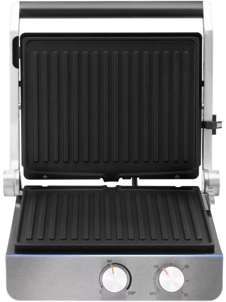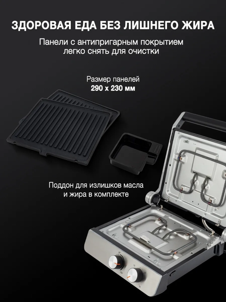 Яркая LED индикация сигнализирует о разогреве и готовности к работе. Съемные панели с антипригарным покрытием позволяют готовить с не большим количеством масла или вообще без него.