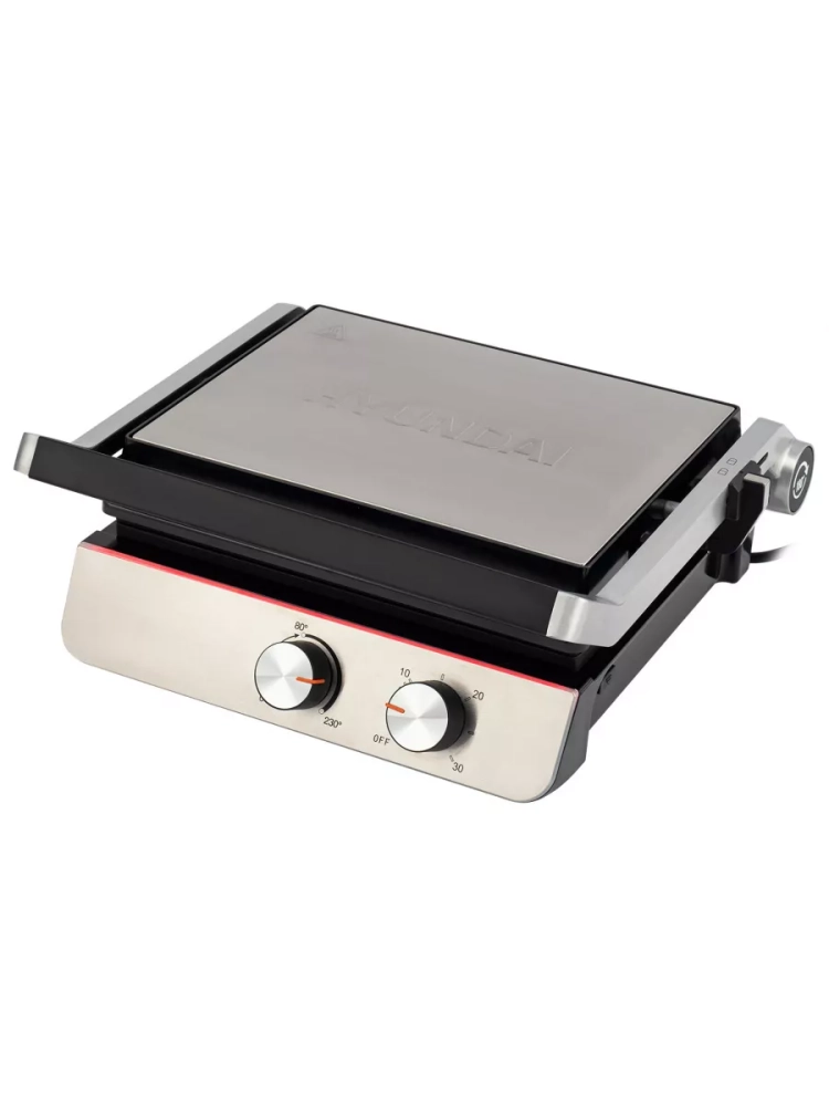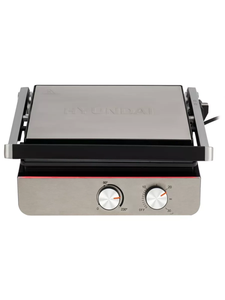 Электрогриль Hyundai HYG-5047 серебристый/черный, мощность 2200Вт, нагревательный элемент: ТЭН. Верхняя крышка имеет «плавающий» фиксатор и адаптирует свое положение под любой продукт с максимальным касанием к панели нагрева. Регулировка температуры позволит подобрать оптимальную для каждого типа продуктов, а таймер проконтролировать процесс степени прожарки/обжарки.