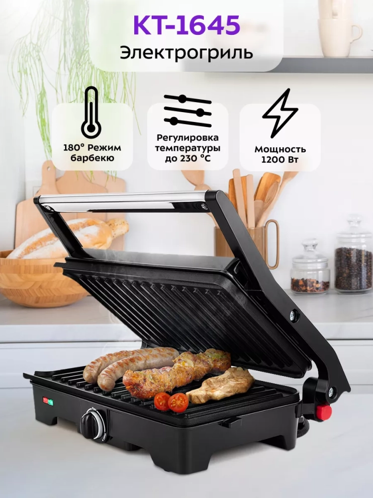 Электрогриль КТ-1645 двусторонний гриль электрический 1200Вт