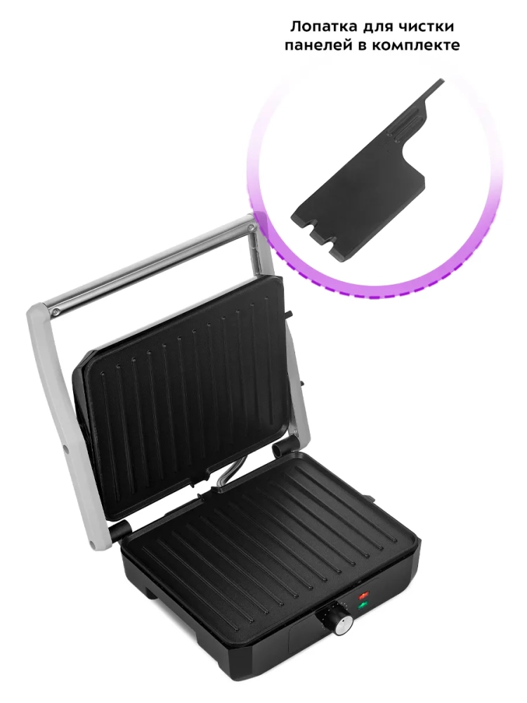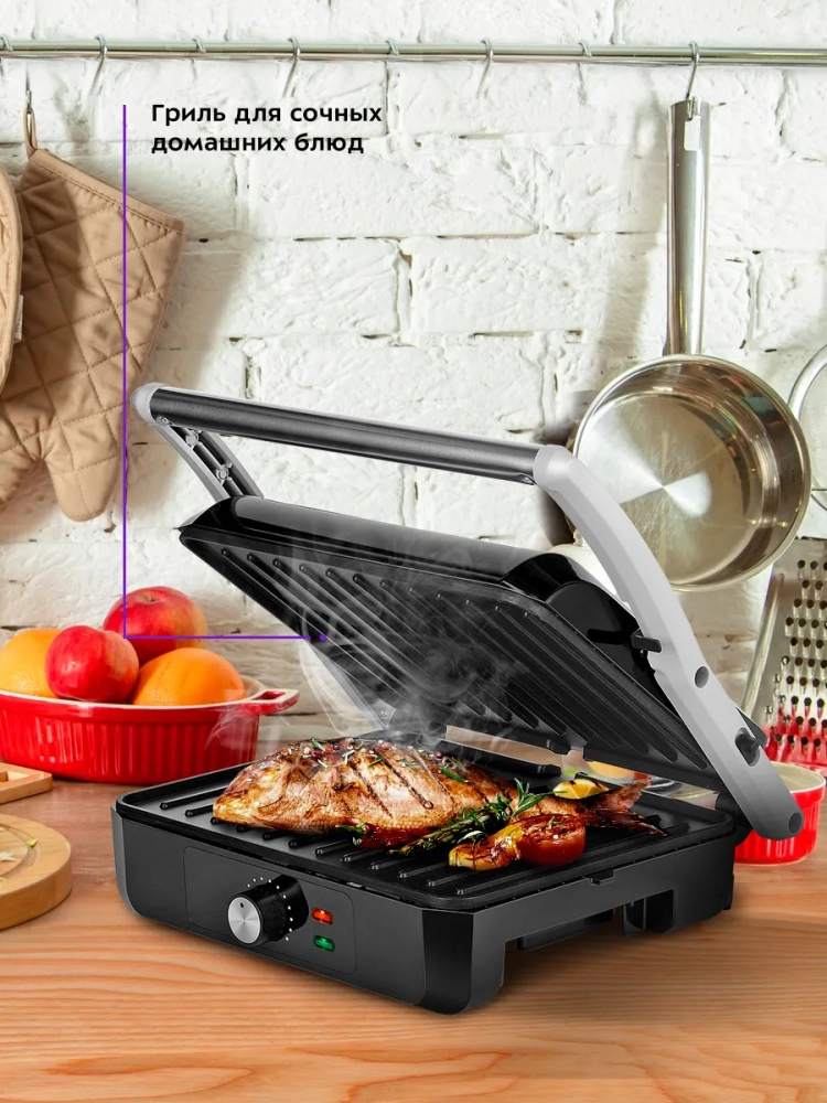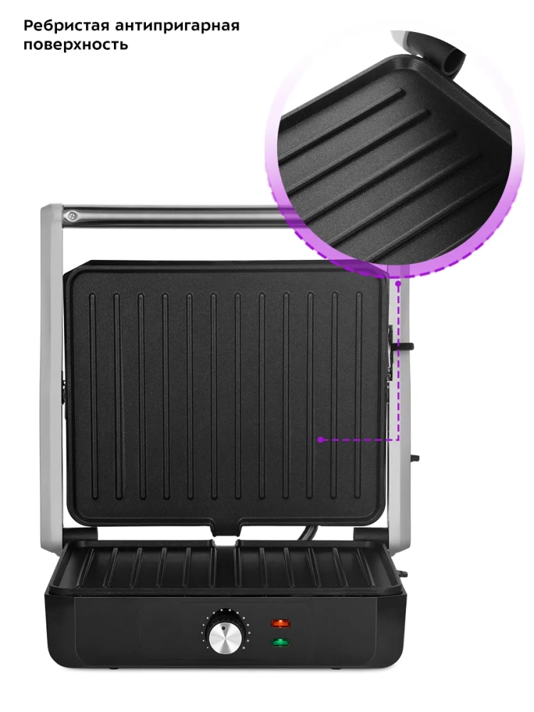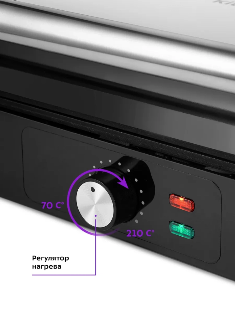 Гриль оснащен термостатом для поддержания температуры панелей, а также индикаторами питания и нагрева. С помощью регулятора температуры вы сможете плавно менять температуру приготовления.