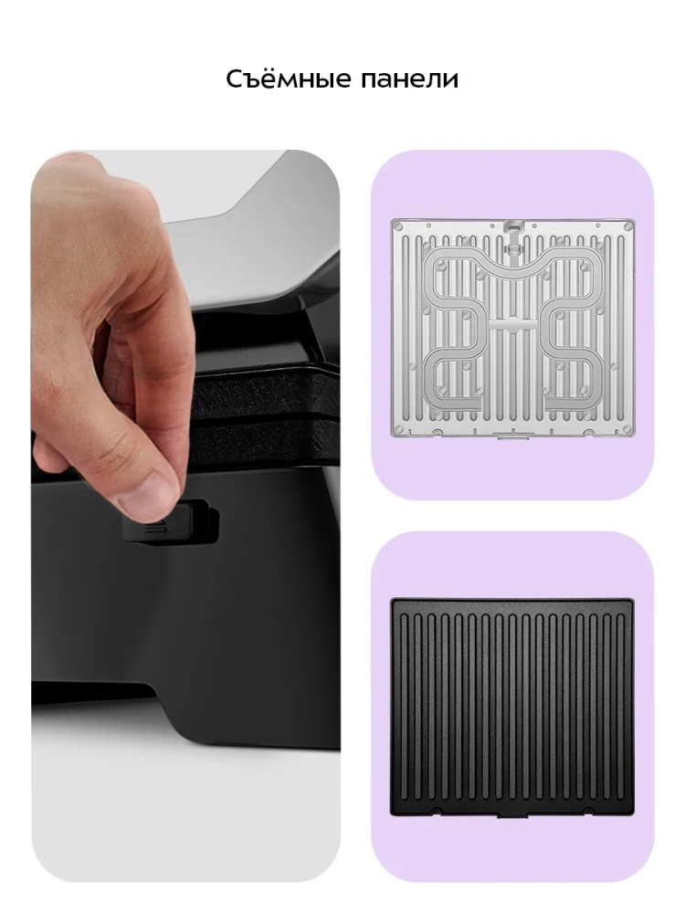 На панели нанесено антипригарное покрытие, что позволяет готовить с минимальным количеством масла или без него. Такое покрытие также облегчает процесс чистки панелей. Панели у этого гриля съемные.