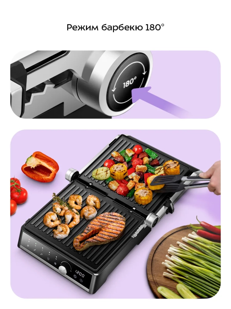 Конструкция гриля позволяет готовить в трех режимах: двустороннем, одностороннем и с приоткрытой крышкой. В двустороннем режиме гриль закрывается крышкой, благодаря чему продукты находятся между двух нагреваемых панелей и готовятся с двух сторон. В режиме приготовления с приоткрытой крышкой верхняя нагреваемая панель опускается не до конца, что полезно при готовке продуктов, которые могут потерять форму из-за давления крышки. В одностороннем режиме крышка гриля откидывается на 180°, благодаря чему гриль превращается в большую жаровню, а продукты можно выложить сразу на две панели. Данная модель оснащена поддоном для слива жира и сока, которые выделяются в процессе приготовления продуктов. Специальный фиксатор сбоку гриля удерживает крышку в закрытом состоянии, что делает готовку, транспортировку и хранение более удобными. Он также позволяет удерживать крышку в приоткрытом положении.