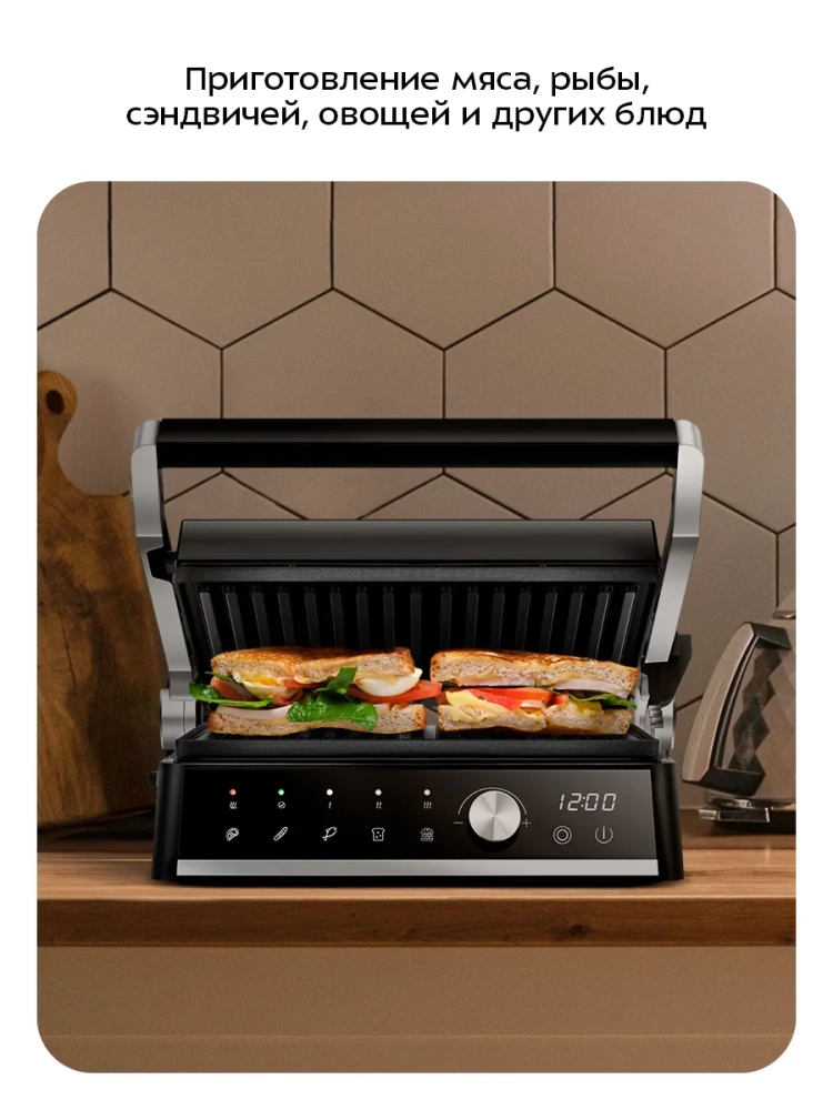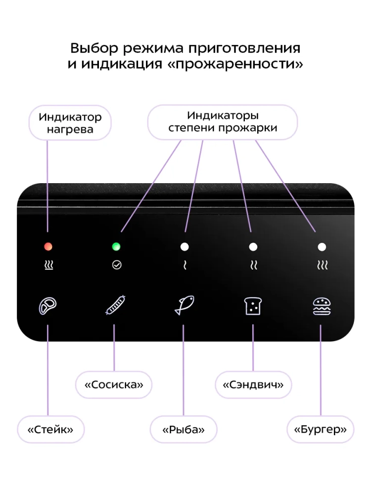 Прибор оснащен панелью управления, с помощью которой вы сможете установить желаемую температуру приготовления, время таймера, а также включить приготовление в одной из 5 предустановленных программ.