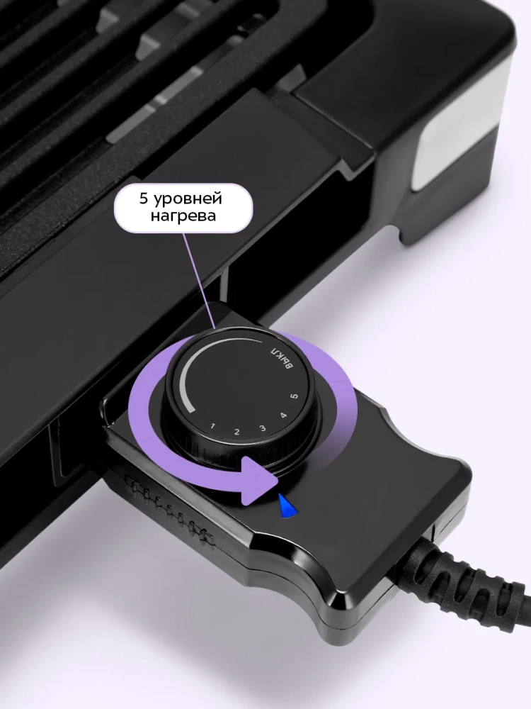 Электрогриль оснащен термостатом для поддержания установленной температуры, а также индикатором нагрева. С помощью регулятора температуры, который является ручкой термостата, можно плавно изменять температуру приготовления. За счет термопредохранителя в случае перегрева электроцепь будет разорвана, и нагрев отключится.