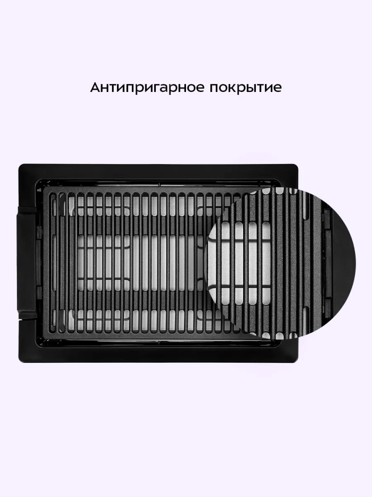 Конструкция данного электрогриля предполагает приготовление без крышки. При этом продукты помещаются на специальную решетку, и в результате на них появляется характерный «полосатый» рисунок, что похоже на приготовление способом барбекю. Продукты необходимо переворачивать в процессе приготовления. Благодаря тому, что нагреватель (ТЭН) находится на дне решетки для гриля, она быстро нагревается и время приготовления сокращается. На решетку для гриля нанесено антипригарное покрытие, что облегчает чистку устройства и позволяет готовить с минимальным количеством масла. Решетка для гриля оснащена пластиковыми ручками для переноски. В данной модели предусмотрен поддон для жидкости, что очень удобно: жир и сок, которые выделяются в процессе приготовления продуктов, будут стекать через отверстия в решетки для гриля в поддон. Поддон легко извлечь и помыть. Противоскользящие ножки обеспечивают устойчивость прибора.