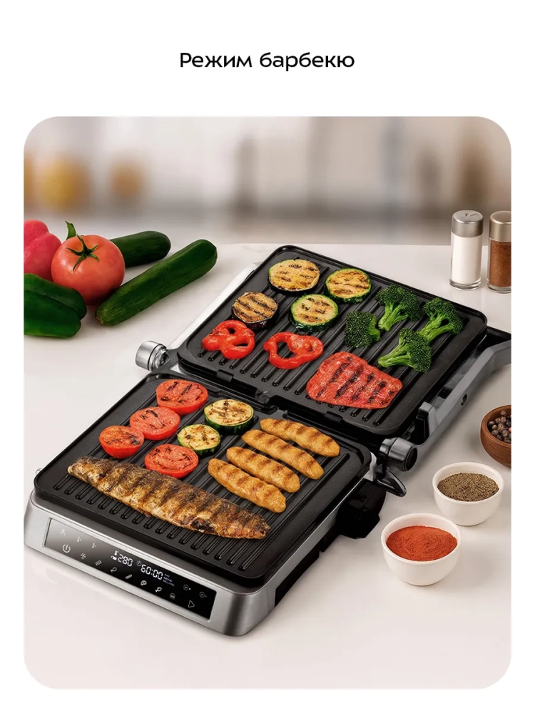 Электрогриль оснащен сенсорной панелью управления, с помощью которой вы можете выбрать одну из 7 программ для приготовления разных продуктов. Программы позволяют использовать готовые шаблоны настроек, разработанные специально под конкретные продукты. Программы отличаются температурой и временем приготовления. Специальная программа «Мясо» создана для ценителей идеальных стейков, она позволяет легко готовить стейки разной степени прожарки — «RARE» (слабая прожарка), «MEDIUM» (средняя прожарка) или «WELL DONE» (полная прожарка). Как только мясо достигнет необходимой степени прожарки, на дисплее загорится соответствующий индикатор.