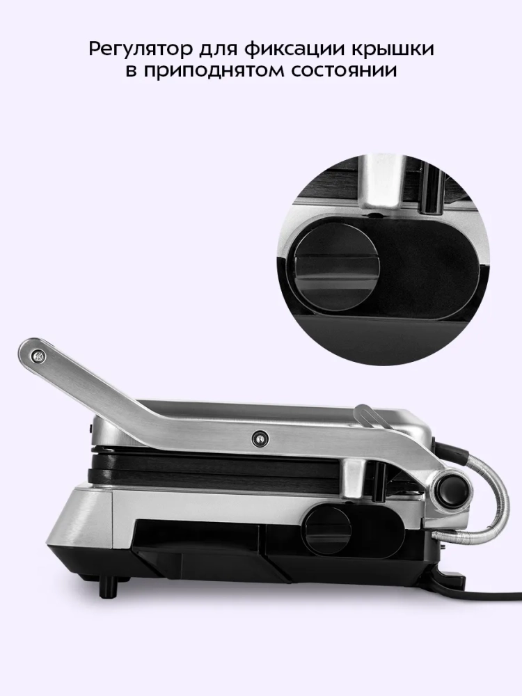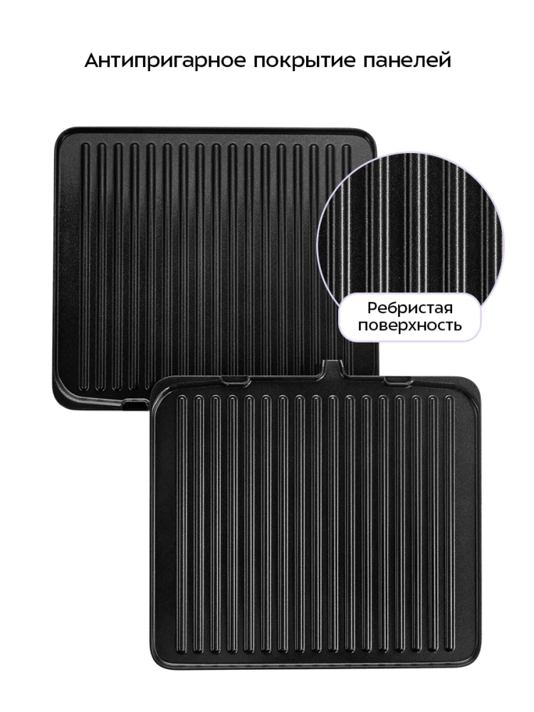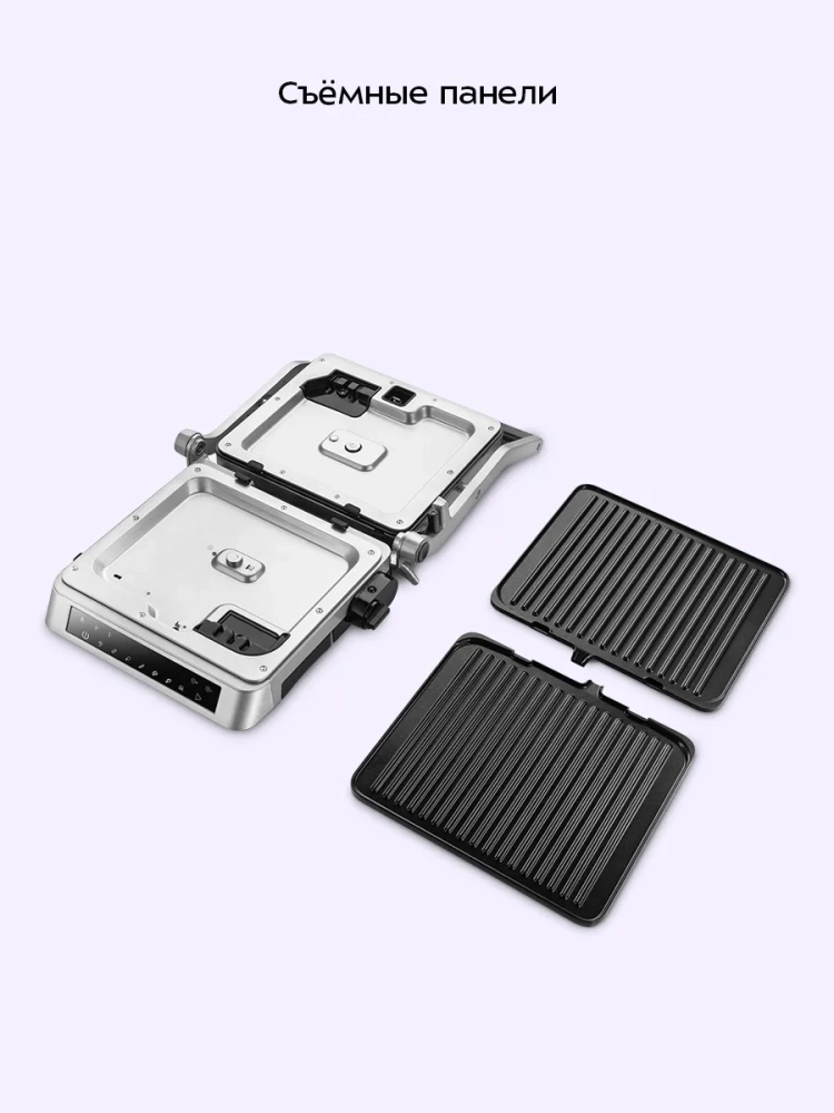Панели прибора съемные, что облегчает чистку и обслуживание прибора. На панели нанесено антипригарное покрытие, что позволяет готовить с минимальным количеством масла. Такое покрытие также облегчает процесс чистки панелей.