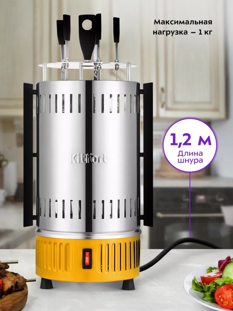 Электрошашлычница Китфорт КТ-1408 предназначена для приготовления шашлыка из мяса, рыбы или овощей, а также для приготовления шавермы (шаурмы), сарделек, сосисок, картошки, курицы-гриль, гренок и других блюд.
