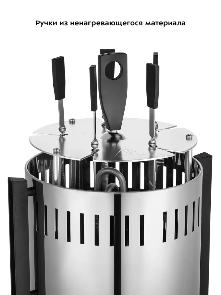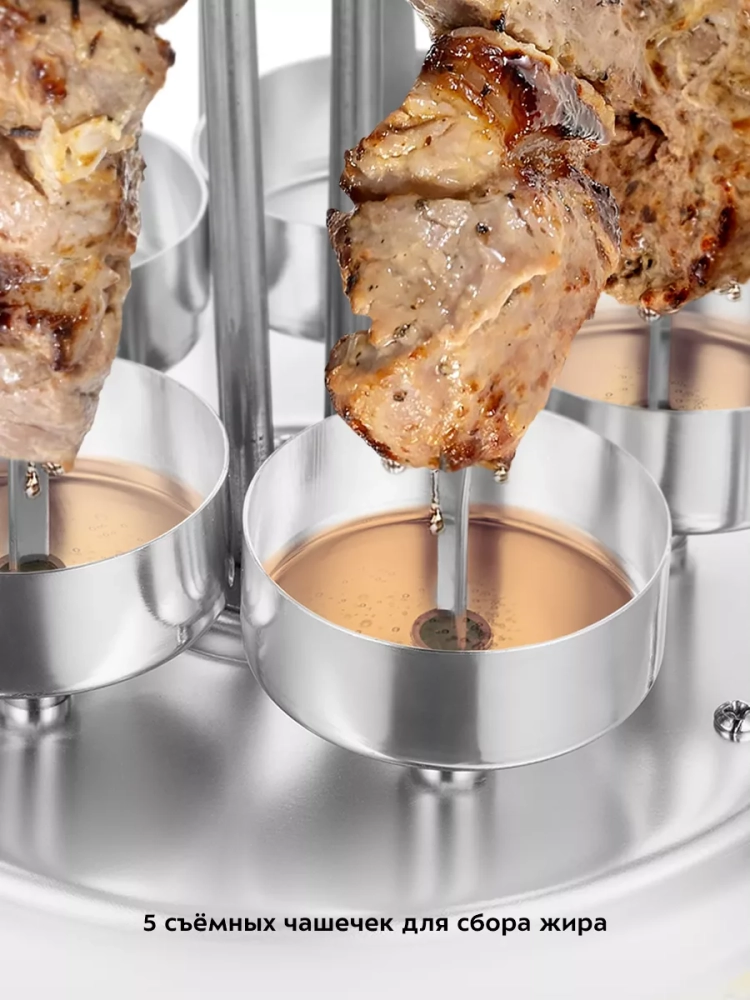 Благодаря вертикальной конструкции электрошашлычница очень компактна и не занимает много места. Под каждым шампуром расположена специальная тарелочка, куда стекает жир. После приготовления эти тарелочки можно снять и легко вымыть, слив жир. Кожух шашлычницы легко снимать и устанавливать. Шампуры оснащены удобными ручками из ненагревающегося материала, поэтому их можно брать руками, не обжигаясь.