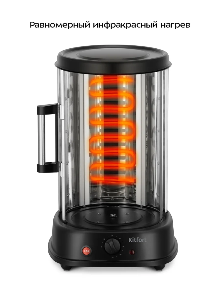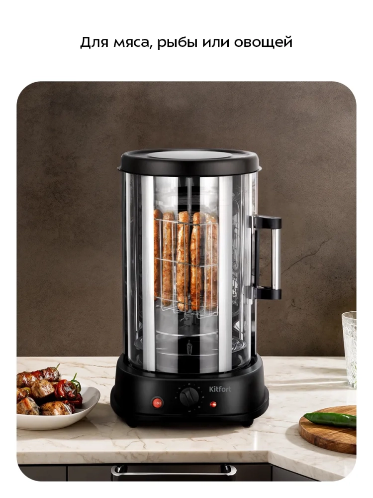 Электрошашлычница Kitfort КТ-1410 позволит приготовить шашлык из мяса, рыбы или овощей, а также шаверму (шаурму), сардельки, сосиски, картофель, курицу гриль, гренки и другие блюда на вертеле или шампурах.