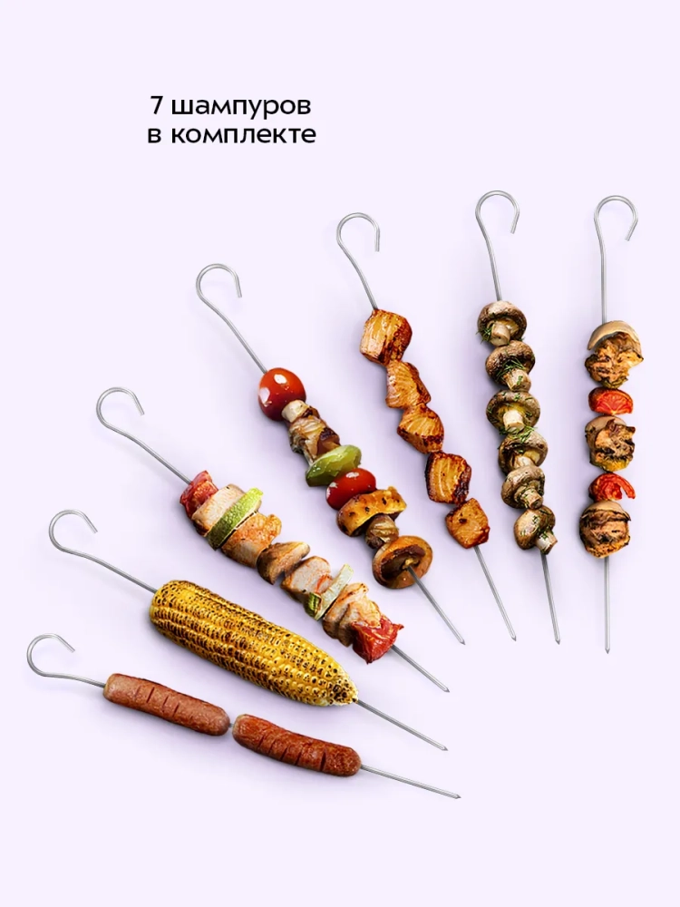 Вертел с зажимами удобен при приготовлении курицы, мяса и других продуктов на вертеле. На вертел можно установить шампуры. В комплекте есть корзины и тарелки для запекания картофеля или других продуктов.