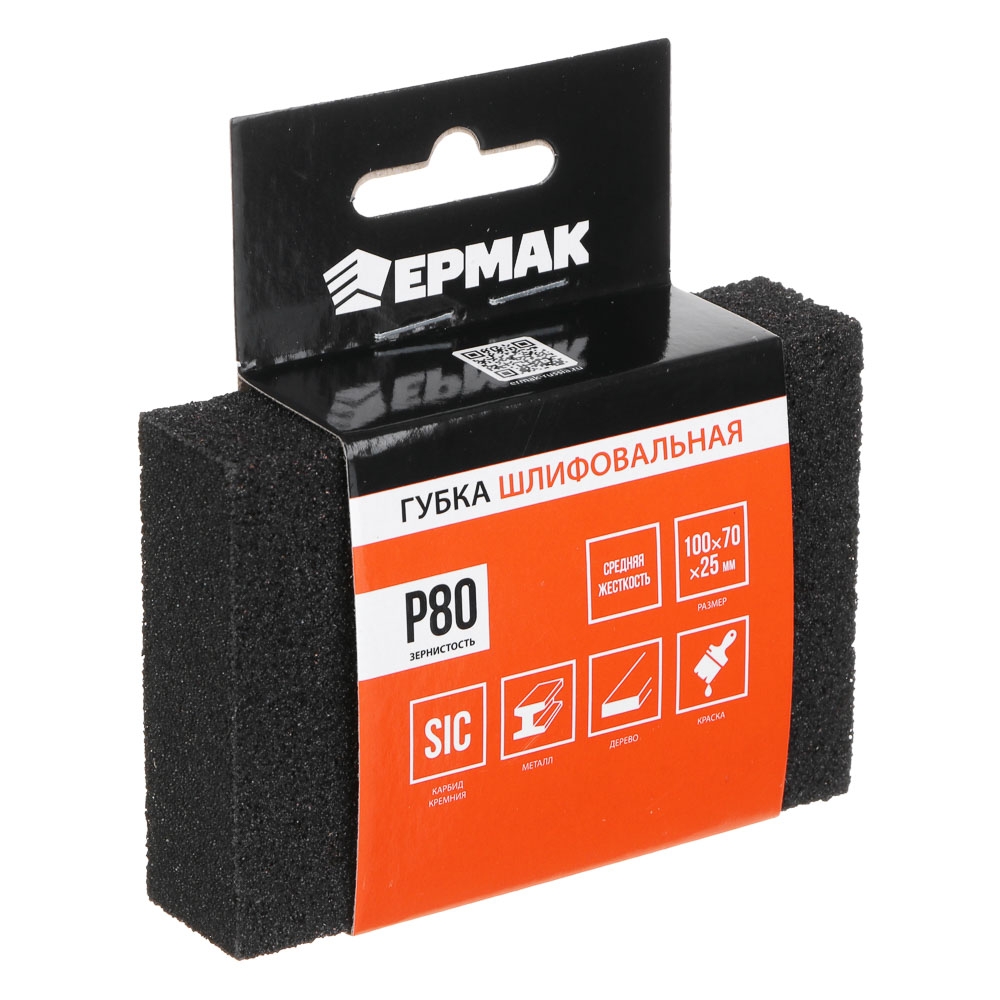 Шлифовальная губка ЕРМАК размером 100х70х25 мм, зернистость Р80. Подходит для ручной обработки различных материалов, включая дерево, металл, пластик и т.д. Позволяет эффективно удалять неровности, шероховатости и старые покрытия.