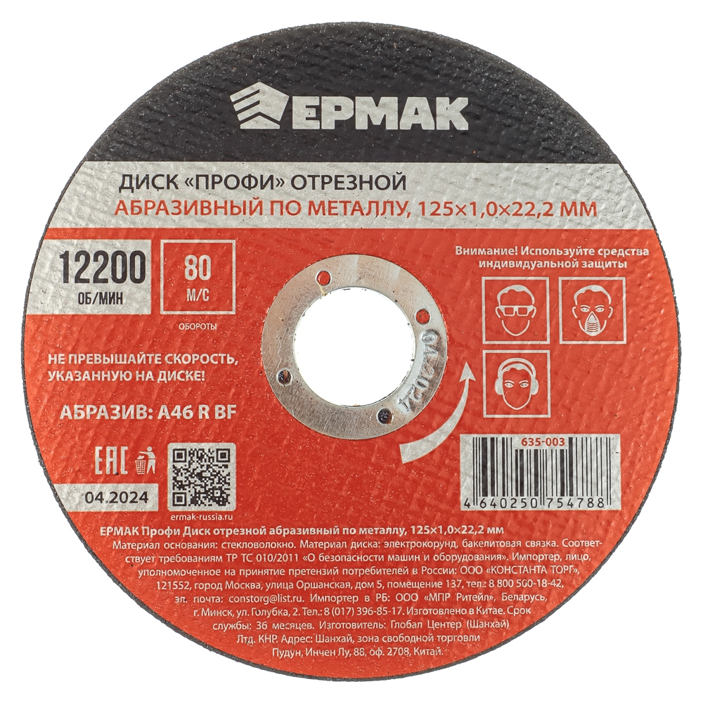 Отрезной абразивный диск по металлу ЕРМАК «Профи» размером 125x1,0x22,2 мм предназначен для резки различных металлов, включая нержавейку. Справляется с металлическими изделиями достаточно большой толщины. Максимальное количество оборотов при использовании совместно с УШМ – 10200 об/мин (80 м/с). Абразив A46 R BF имеет хороший запас прочности и износостойкости.