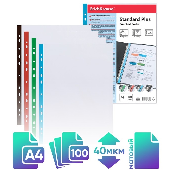 Файл-вкладыш А4, 40 мкм, ErichKrause Standard Plus, тиснение, вертикальный, с цветной полосой, 100 штук