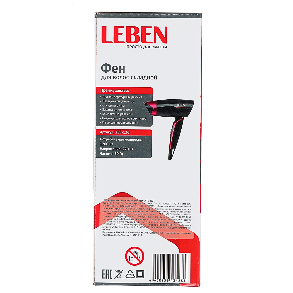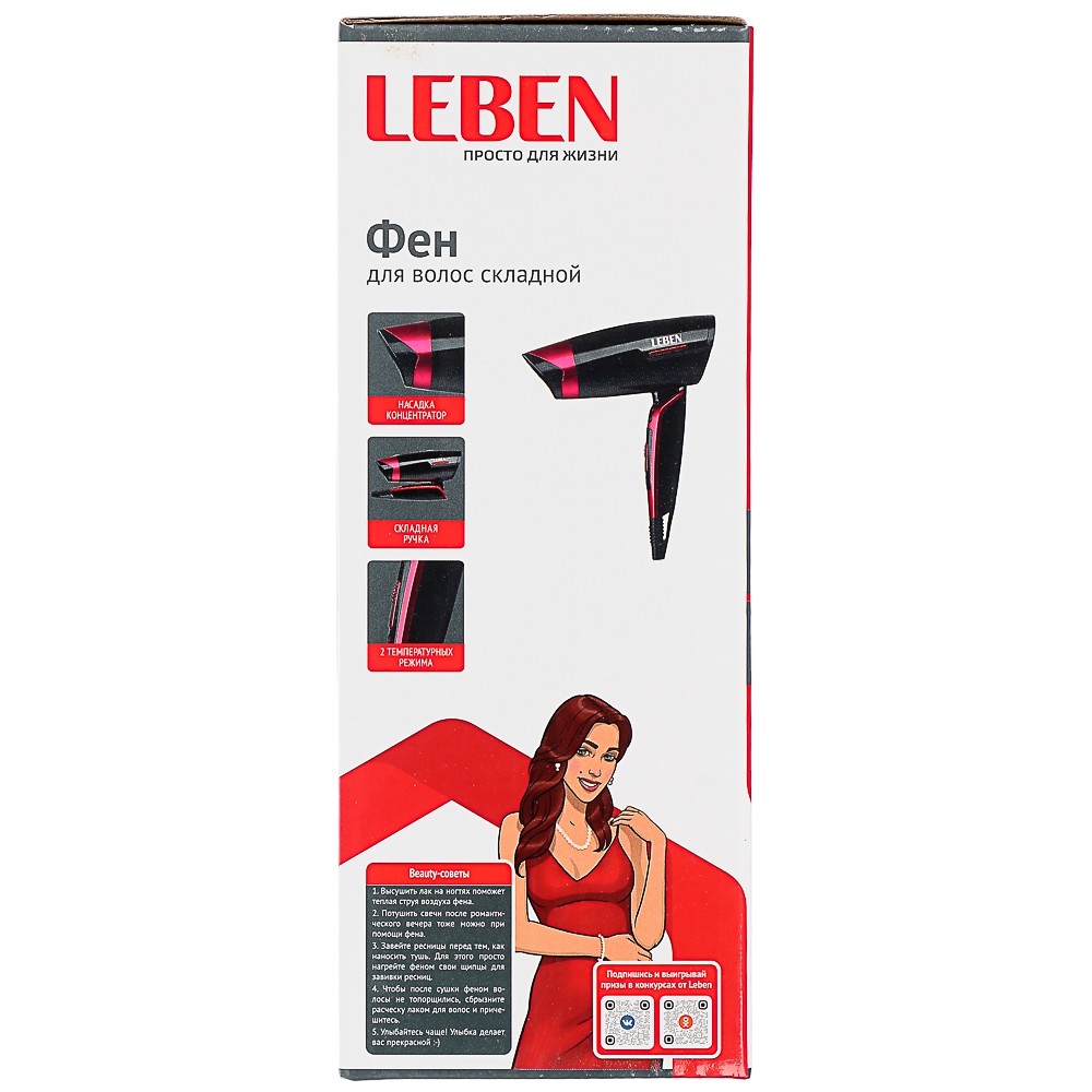 Фен для волос Leben на 2200 Вт обеспечивает мощный воздушный поток для быстрой укладки. Система турмалиновой ионизации нейтрализует статическое электричество и улучшает внешний вид волос — делает их шелковистыми и блестящими.Фен Leben укомплектован ионизацией, которая придает объем тонким прядям и помогает создать упругие локоны. Холодный обдув фена фиксирует прическу, не позволяя ей распасться сразу после выхода из дома.