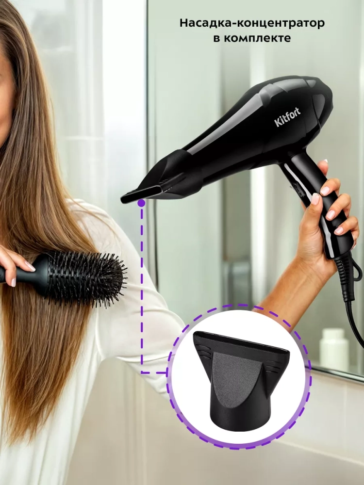 Фены Kitfort отличаются высоким качеством и надежностью. Этот фен для волос — идеальный выбор для тех, кто ценит профессиональный подход к укладке. Насадки, включая концентратор, позволяют направлять поток воздуха точно на нужные участки волос, обеспечивая идеальную укладку. Фен также оснащен петлей для удобного хранения на крючке, что делает его использование еще более комфортным.
