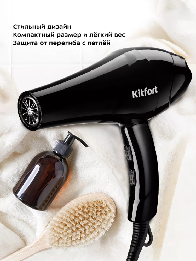 Фен Kitfort — это бытовая техника, которая подходит как для женской, так и для мужской укладки волос. Благодаря функции подачи холодного воздуха, фен позволяет закрепить укладку и придать волосам дополнительный объем. Петелька для подвешивания и защита шнура от перегибов обеспечивают удобство хранения и долговечность прибора.